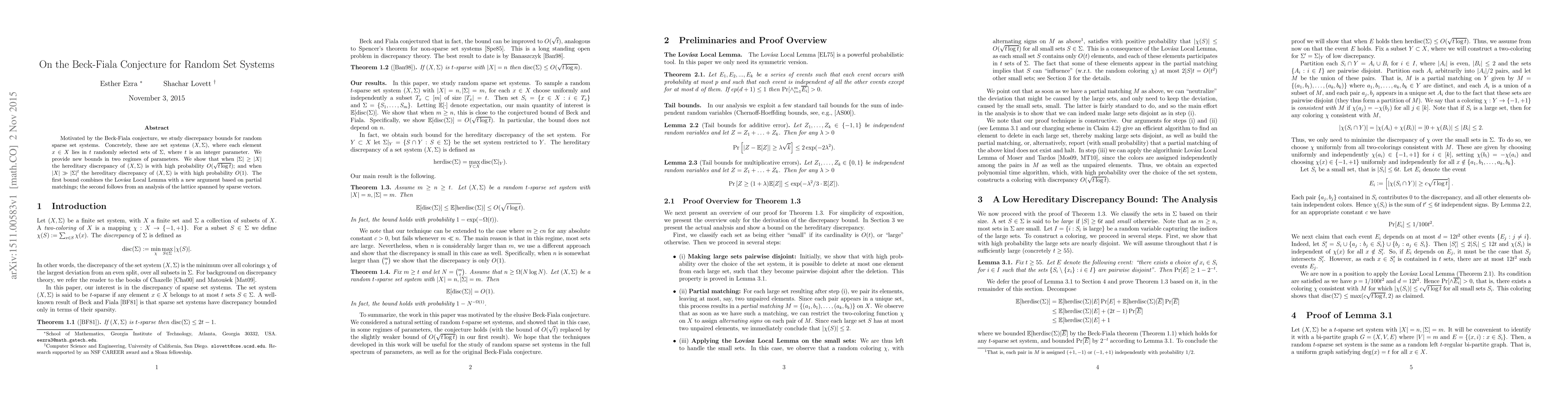 Motivated by the Beck-Fiala conjecture, we study discrepancy bounds for random sparse set systems. Concretely, these are set systems $(X,\Sigma)$, where each element $x \in X$ lies in $t$ randomly selected sets of $\Sigma$, where $t$ is an integer parameter. We provide new bounds in two regimes of parameters. We show that when $|\Sigma| \ge |X|$ the hereditary discrepancy of $(X,\Sigma)$ is with high probability $O(\sqrt{t \log t})$; and when $|X| \gg |\Sigma|^t$ the hereditary discrepancy of $(X,\Sigma)$ is with high probability $O(1)$. The first bound combines the Lov{\'a}sz Local Lemma with a new argument based on partial matchings; the second follows from an analysis of the lattice spanned by sparse vectors.