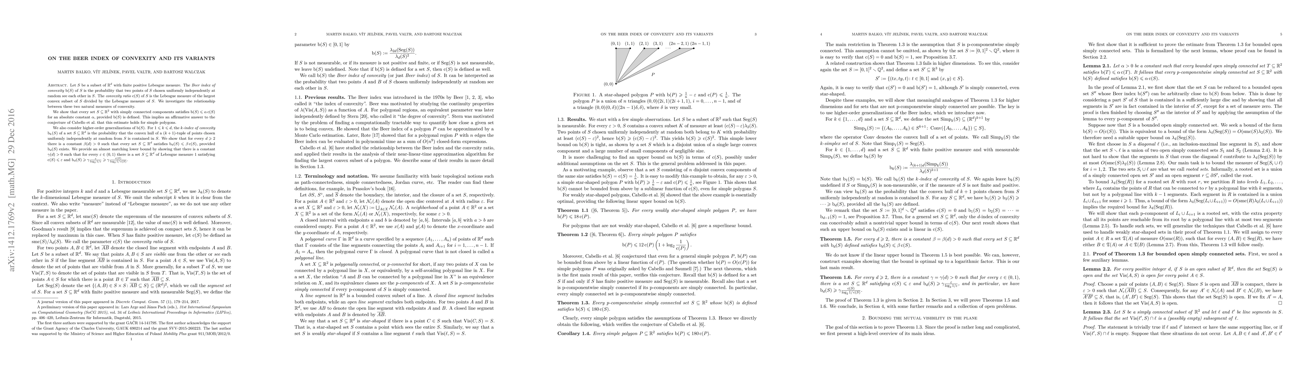 Let $S$ be a subset of $\mathbb{R}^d$ with finite positive Lebesgue measure. The Beer index of convexity $\operatorname{b}(S)$ of $S$ is the probability that two points of $S$ chosen uniformly independently at random see each other in $S$. The convexity ratio $\operatorname{c}(S)$ of $S$ is the Lebesgue measure of the largest convex subset of $S$ divided by the Lebesgue measure of $S$. We investigate the relationship between these two natural measures of convexity. We show that every set $S\subseteq\mathbb{R}^2$ with simply connected components satisfies $\operatorname{b}(S)\leq\alpha\operatorname{c}(S)$ for an absolute constant $\alpha$, provided $\operatorname{b}(S)$ is defined. This implies an affirmative answer to the conjecture of Cabello et al. that this estimate holds for simple polygons. We also consider higher-order generalizations of $\operatorname{b}(S)$. For $1\leq k\leq d$, the $k$-index of convexity $\operatorname{b}_k(S)$ of a set $S\subseteq\mathbb{R}^d$ is the probability that the convex hull of a $(k+1)$-tuple of points chosen uniformly independently at random from $S$ is contained in $S$. We show that for every $d\geq 2$ there is a constant $\beta(d)>0$ such that every set $S\subseteq\mathbb{R}^d$ satisfies $\operatorname{b}_d(S)\leq\beta\operatorname{c}(S)$, provided $\operatorname{b}_d(S)$ exists. We provide an almost matching lower bound by showing that there is a constant $\gamma(d)>0$ such that for every $\varepsilon\in(0,1)$ there is a set $S\subseteq\mathbb{R}^d$ of Lebesgue measure $1$ satisfying $\operatorname{c}(S)\leq\varepsilon$ and $\operatorname{b}_d(S)\geq\gamma\frac{\varepsilon}{\log_2{1/\varepsilon}}\geq\gamma\frac{\operatorname{c}(S)}{\log_2{1/\operatorname{c}(S)}}$.