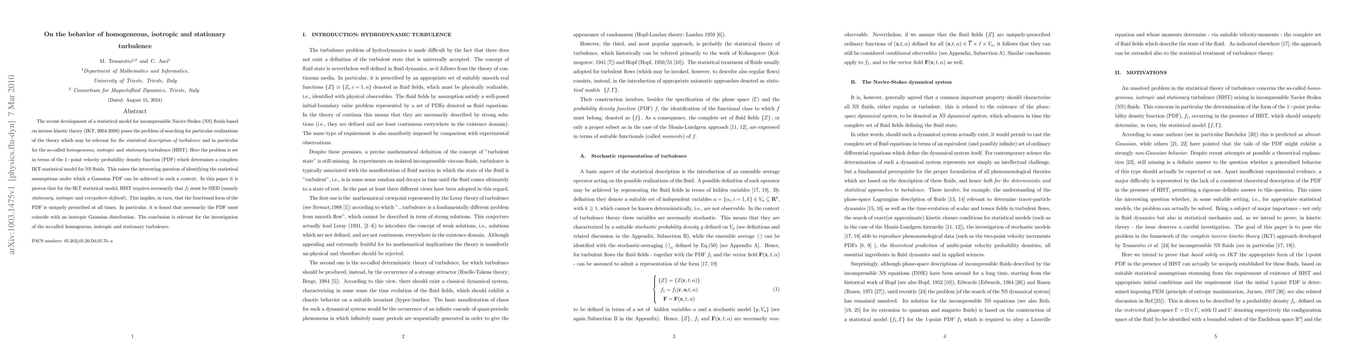 This paper develops a statistical model for incompressible Navier-Stokes fluids based on inverse kinetic theory, proving that homogeneous, isotropic, and stationary turbulence (HIST) necessitates a stationary, isotropic, and everywhere-defined 1-point velocity probability density function (PDF). It concludes that the PDF must coincide with an isotropic Gaussian distribution.