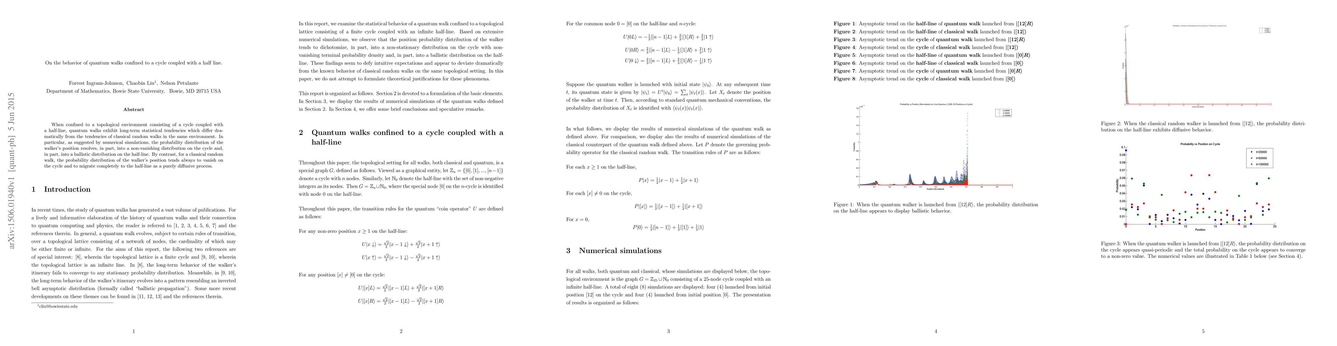 When confined to a topological environment consisting of a cycle coupled with a half-line, quantum walks exhibit long-term statistical tendencies which differ dramatically from the tendencies of classical random walks in the same environment. In particular, as suggested by numerical simulations, the probability distribution of the walker's position resolves, in part, into a non-vanishing distribution on the cycle and, in part, into a ballistic distribution on the half-line. By contrast, for a classical random walk, the probability distribution of the walker's position tends always to vanish on the cycle and to migrate completely to the half-line as a purely diffusive process.