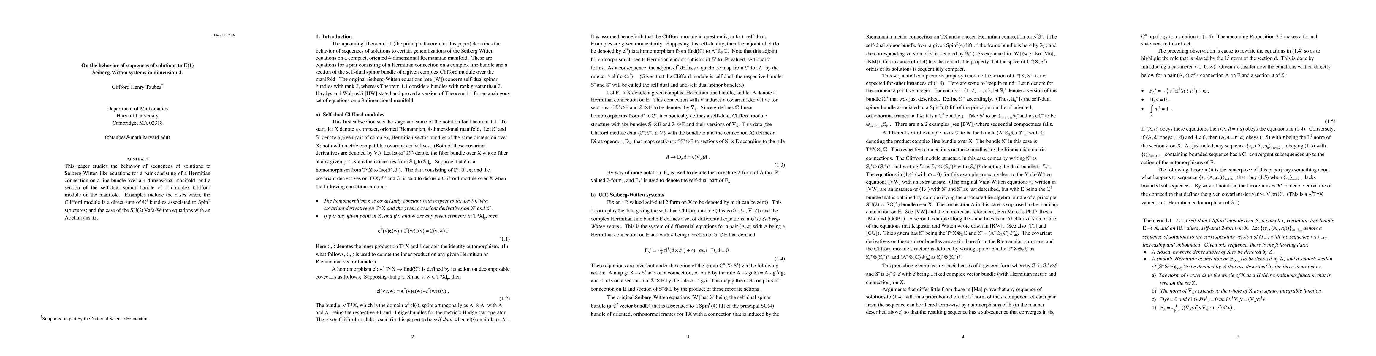 This paper studies the behavior of sequences of solutions to Seiberg-Witten like equations for a pair consisting of a Hermitian connection on a line bundle over a 4-dimensional manifold and a section of the self-dual spinor bundle of a complex Clifford module on the manifold. Examples include the cases where the Clifford module is a direct sum of C2 bundles associated to SpinC structures; and the case of the SU(2) Vafa-Witten equations with an Abelian ansatz.