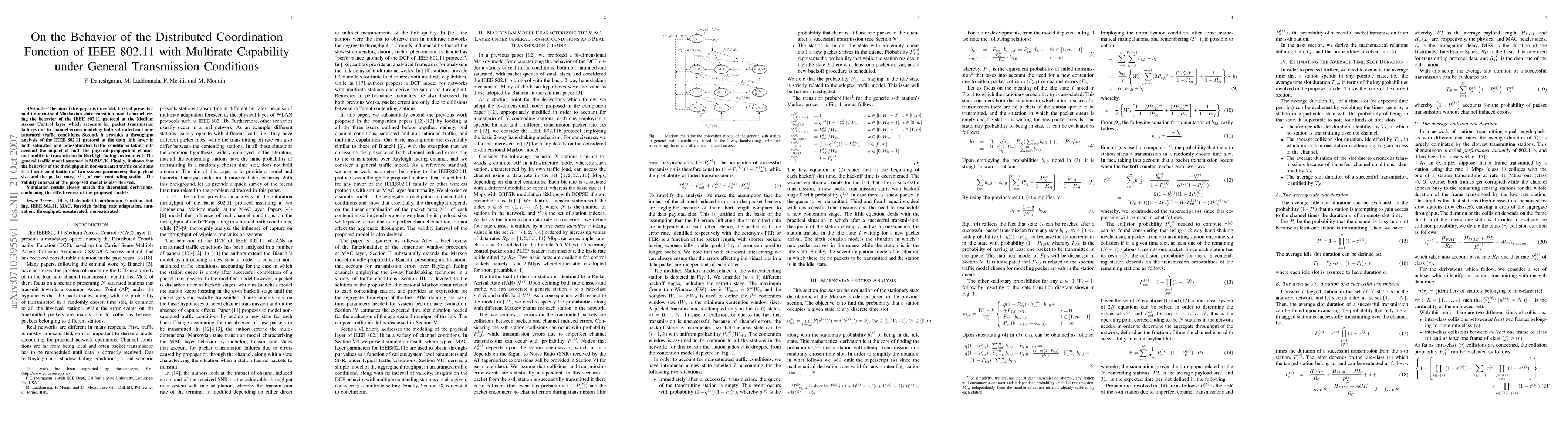 The aim of this paper is threefold. First, it presents a multi-dimensional Markovian state transition model characterizing the behavior of the IEEE 802.11 protocol at the Medium Access Control layer which accounts for packet transmission failures due to channel errors modeling both saturated and non-saturated traffic conditions. Second, it provides a throughput analysis of the IEEE 802.11 protocol at the data link layer in both saturated and non-saturated traffic conditions taking into account the impact of both the physical propagation channel and multirate transmission in Rayleigh fading environment. The general traffic model assumed is M/M/1/K. Finally, it shows that the behavior of the throughput in non-saturated traffic conditions is a linear combination of two system parameters; the payload size and the packet rates, $\lambda^{(s)}$, of each contending station. The validity interval of the proposed model is also derived. Simulation results closely match the theoretical derivations, confirming the effectiveness of the proposed models.