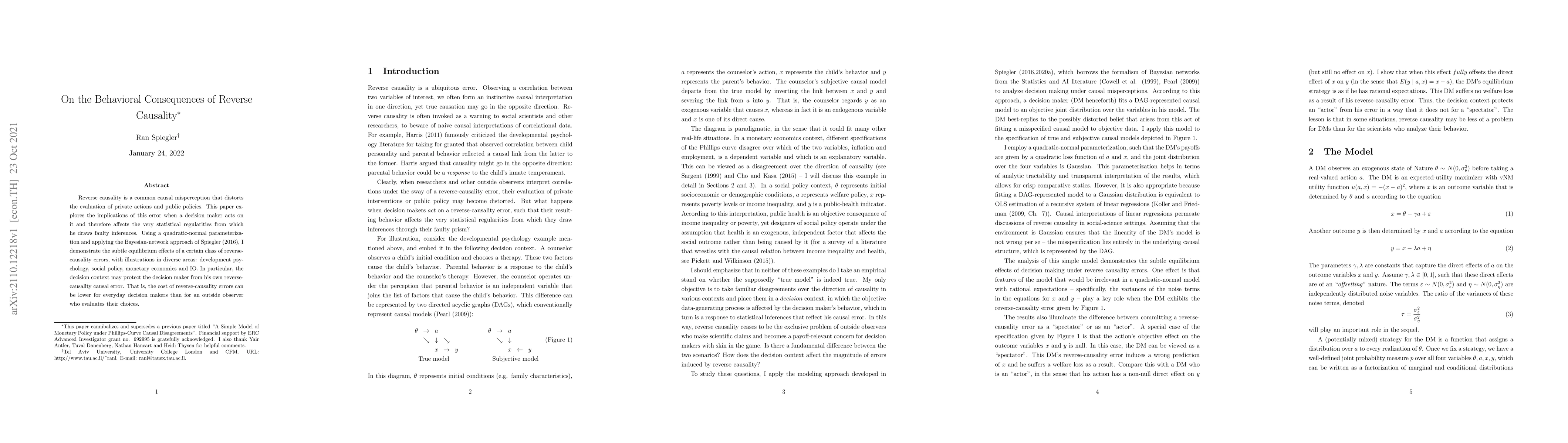 Reverse causality is a common causal misperception that distorts the evaluation of private actions and public policies. This paper explores the implications of this error when a decision maker acts on it and therefore affects the very statistical regularities from which he draws faulty inferences. Using a quadratic-normal parameterization and applying the Bayesian-network approach of Spiegler (2016), I demonstrate the subtle equilibrium effects of a certain class of reverse-causality errors, with illustrations in diverse areas: development psychology, social policy, monetary economics and IO. In particular, the decision context may protect the decision maker from his own reverse-causality causal error. That is, the cost of reverse-causality errors can be lower for everyday decision makers than for an outside observer who evaluates their choices.