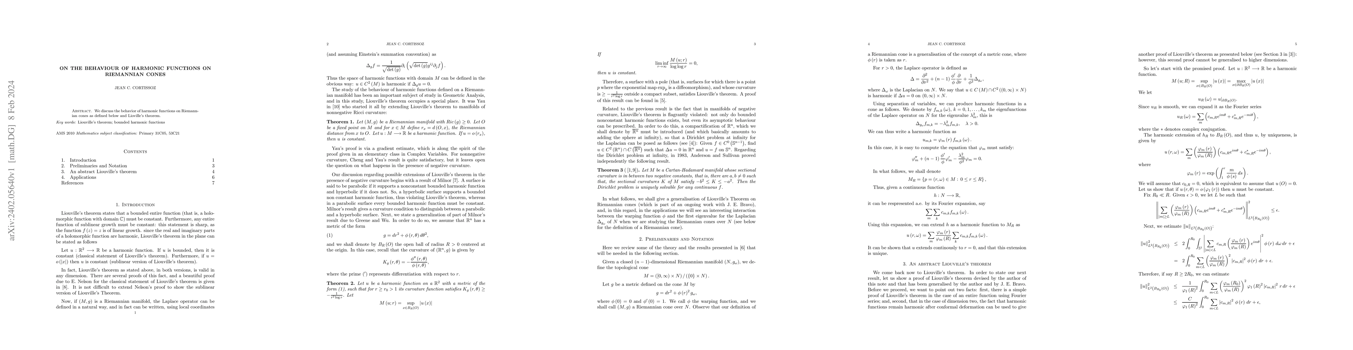 Summary: This paper explores the properties of harmonic functions on Riemannian cones and examines how they relate to Liouville's theorem, providing insights into their behavior and significance in differential geometry.