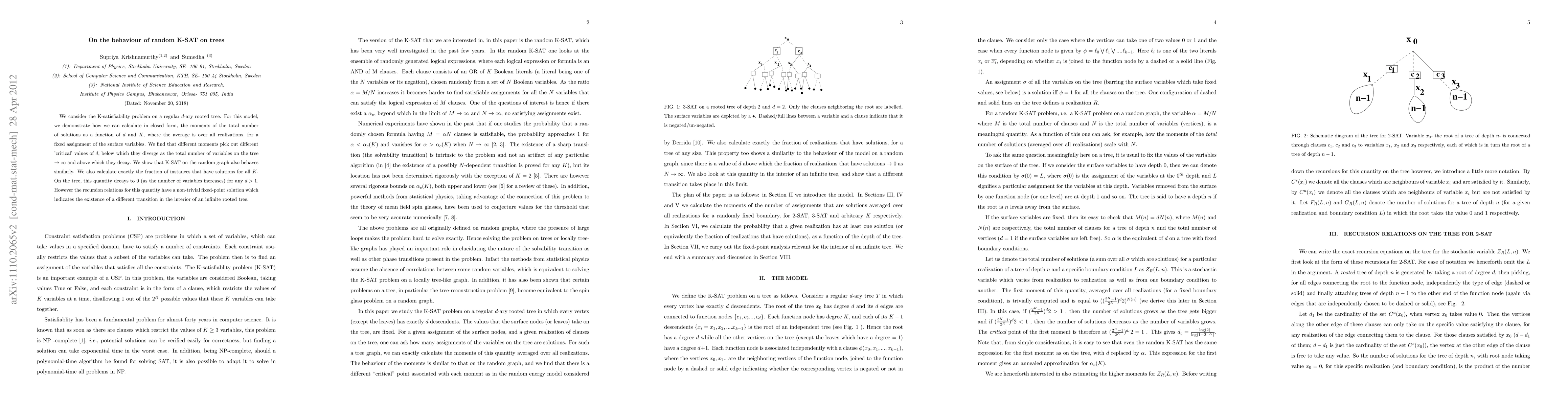 We consider the K-satisfiability problem on a regular d-ary rooted tree. For this model, we demonstrate how we can calculate in closed form, the moments of the total number of solutions as a function of d and K, where the average is over all realizations, for a fixed assignment of the surface variables. We find that different moments pick out different 'critical' values of d, below which they diverge as the total number of variables on the tree goes to infinity and above which they decay. We show that K-SAT on the random graph also behaves similarly. We also calculate exactly the fraction of instances that have solutions for all K. On the tree, this quantity decays to 0 (as the number of variables increases) for any d>1. However the recursion relations for this quantity have a non-trivial fixed-point solution which indicates the existence of a different transition in the interior of an infinite rooted tree.