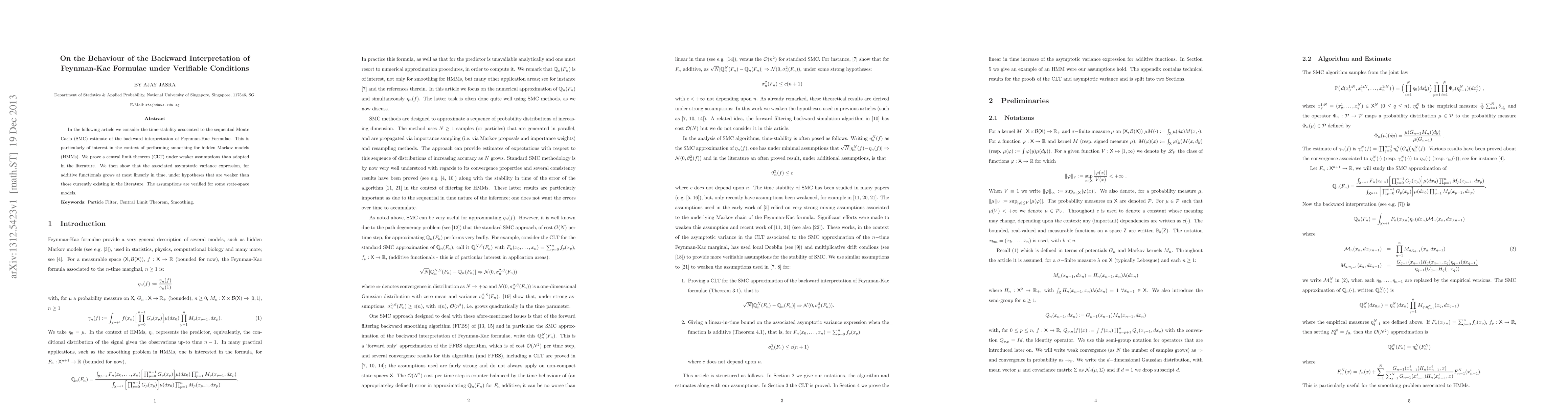 This paper investigates the time-stability of SMC estimates for the backward interpretation of Feynman-Kac formulae, particularly for smoothing in HMMs. It proves a central limit theorem under weaker assumptions and shows that the asymptotic variance grows linearly in time under similarly relaxed hypotheses, verified for certain state-space models.