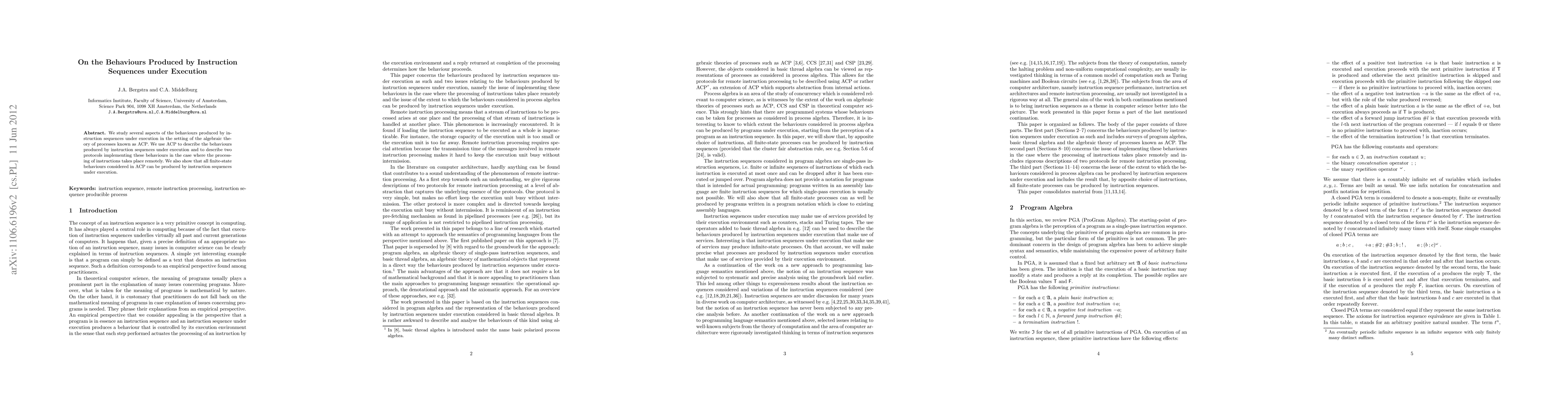 This paper explores the behaviours of instruction sequences during execution using the algebraic theory of processes (ACP) and demonstrates that all finite-state behaviours in ACP can be realized through such sequences, while also detailing two remote processing protocols.