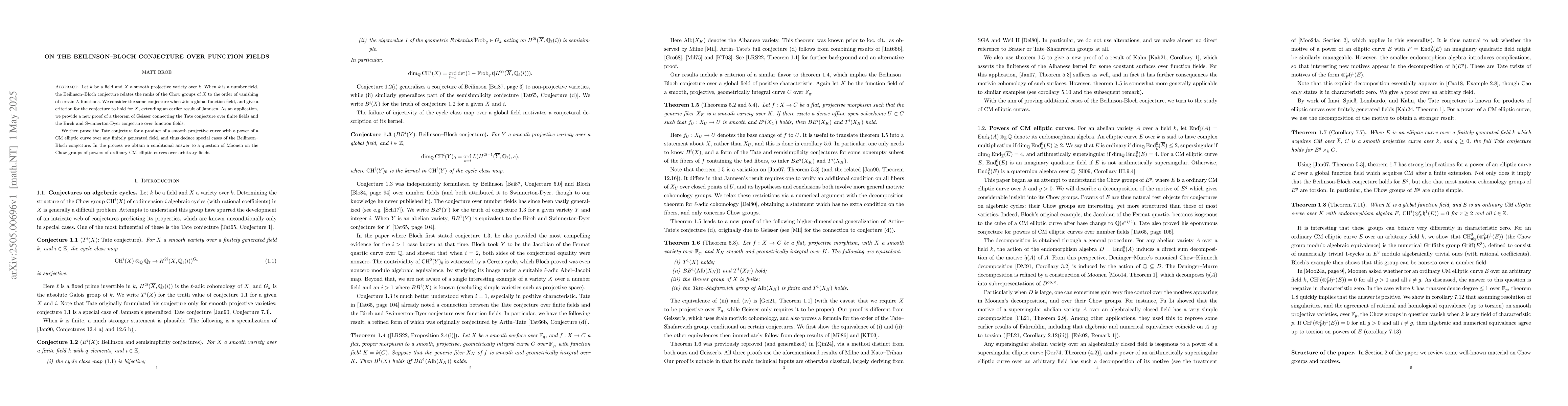 Let k be a field and X a smooth projective variety over k. When k is a number field, the Beilinson--Bloch conjecture relates the ranks of the Chow groups of X to the order of vanishing of certain L-functions. We consider the same conjecture when k is a global function field, and give a criterion for the conjecture to hold for X, extending an earlier result of Jannsen. As an application, we provide a new proof of a theorem of Geisser connecting the Tate conjecture over finite fields and the Birch and Swinnerton-Dyer conjecture over function fields. We then prove the Tate conjecture for a product of a smooth projective curve with a power of a CM elliptic curve over any finitely generated field, and thus deduce special cases of the Beilinson--Bloch conjecture. In the process we obtain a conditional answer to a question of Moonen on the Chow groups of powers of ordinary CM elliptic curves over arbitrary fields.