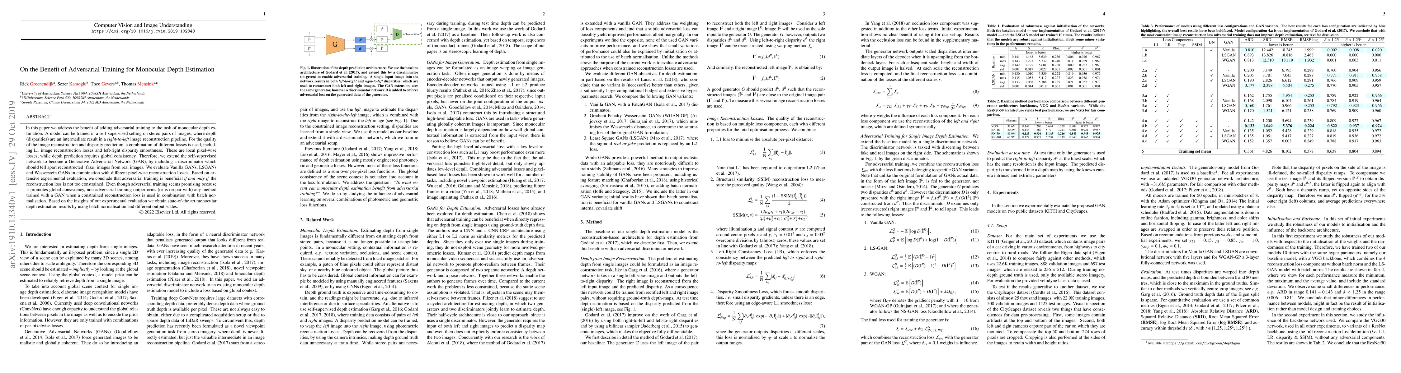 Adversarial training improves monocular depth estimation when reconstruction loss is not too constrained, but non-adversarial methods outperform GANs with constrained losses.