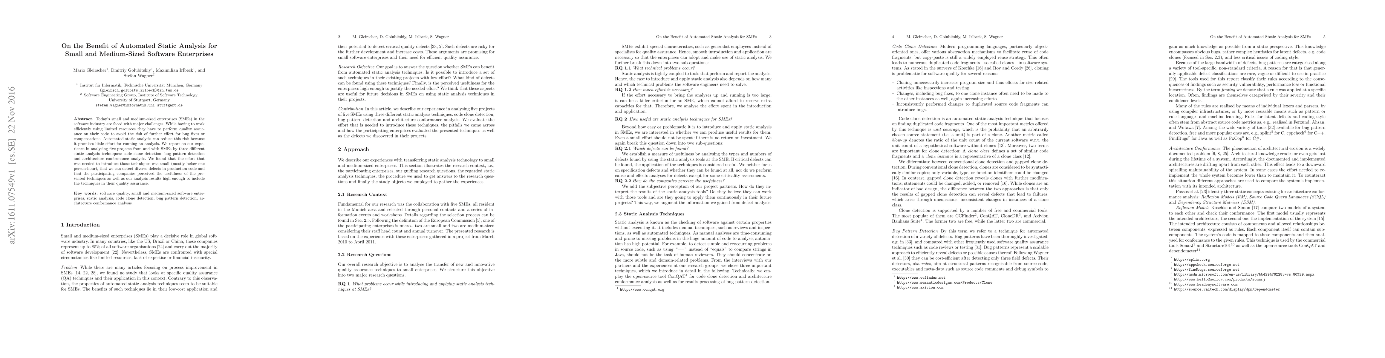 Today's small and medium-sized enterprises (SMEs) in the software industry are faced with major challenges. While having to work efficiently using limited resources they have to perform quality assurance on their code to avoid the risk of further effort for bug fixes or compensations. Automated static analysis can reduce this risk because it promises little effort for running an analysis. We report on our experience in analysing five projects from and with SMEs by three different static analysis techniques: code clone detection, bug pattern detection and architecture conformance analysis. We found that the effort that was needed to introduce those techniques was small (mostly below one person-hour), that we can detect diverse defects in production code and that the participating companies perceived the usefulness of the presented techniques as well as our analysis results high enough to include the techniques in their quality assurance.