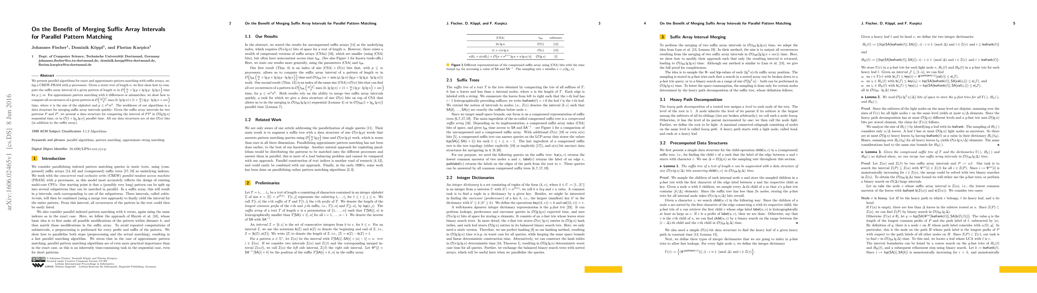 This paper presents parallel algorithms for exact and approximate pattern matching using suffix arrays, focusing on merging suffix array intervals efficiently. The key contribution is a data structure that merges intervals in $O(\lg\lg n)$ sequential or $O(1+\lg_p\lg n)$ parallel time, enabling fast computation of pattern occurrences.