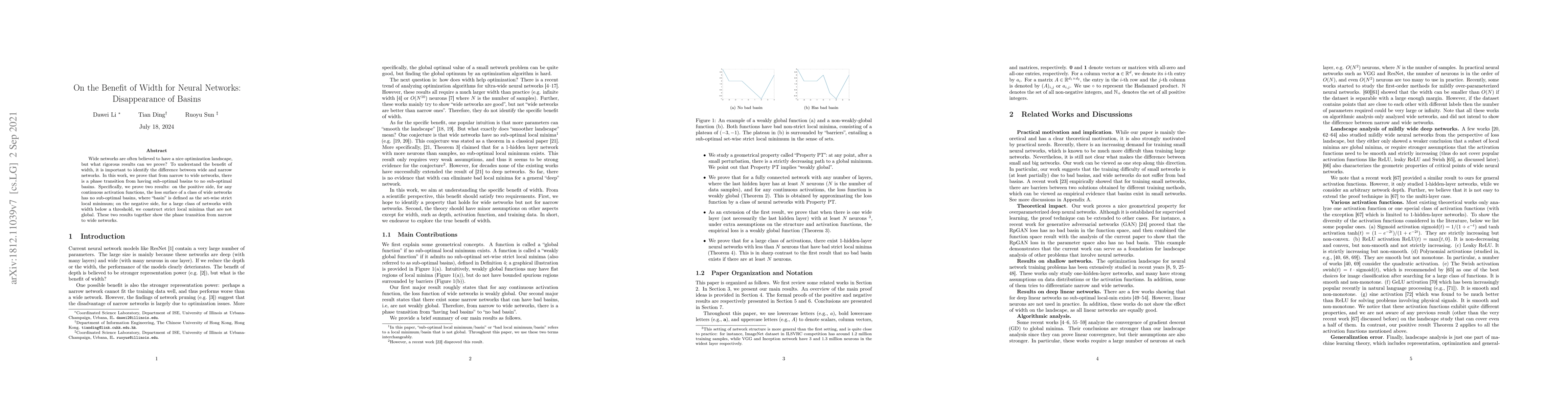 Wide networks are often believed to have a nice optimization landscape, but what rigorous results can we prove? To understand the benefit of width, it is important to identify the difference between wide and narrow networks. In this work, we prove that from narrow to wide networks, there is a phase transition from having sub-optimal basins to no sub-optimal basins. Specifically, we prove two results: on the positive side, for any continuous activation functions, the loss surface of a class of wide networks has no sub-optimal basins, where "basin" is defined as the set-wise strict local minimum; on the negative side, for a large class of networks with width below a threshold, we construct strict local minima that are not global. These two results together show the phase transition from narrow to wide networks.