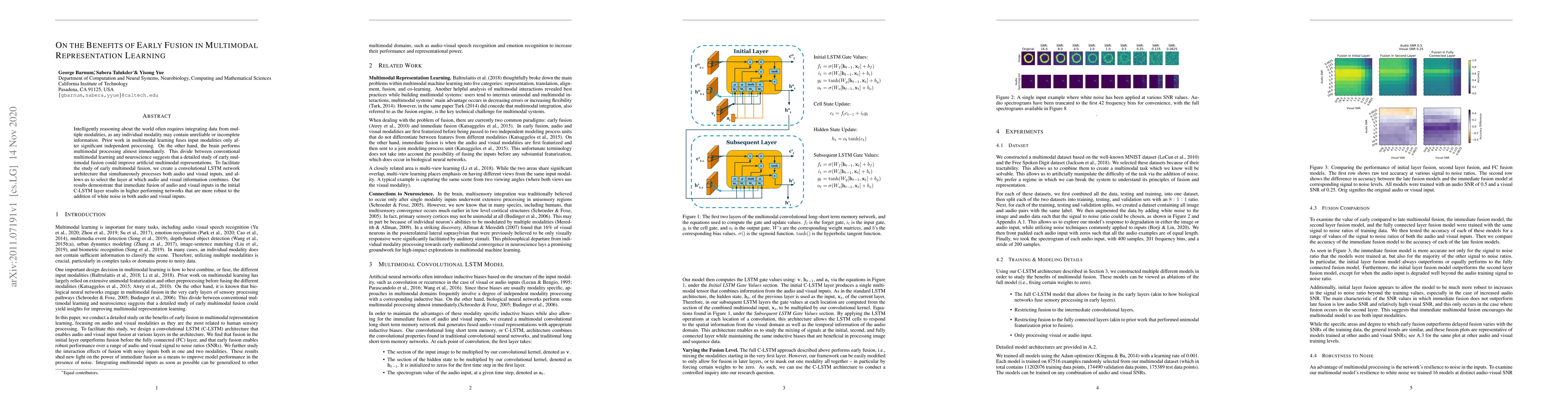 This paper explores the benefits of early fusion in multimodal representation learning, proposing a convolutional LSTM network that processes audio and visual inputs simultaneously. The study finds that immediate fusion in the initial layer leads to higher performance and greater robustness to noise compared to late fusion methods.