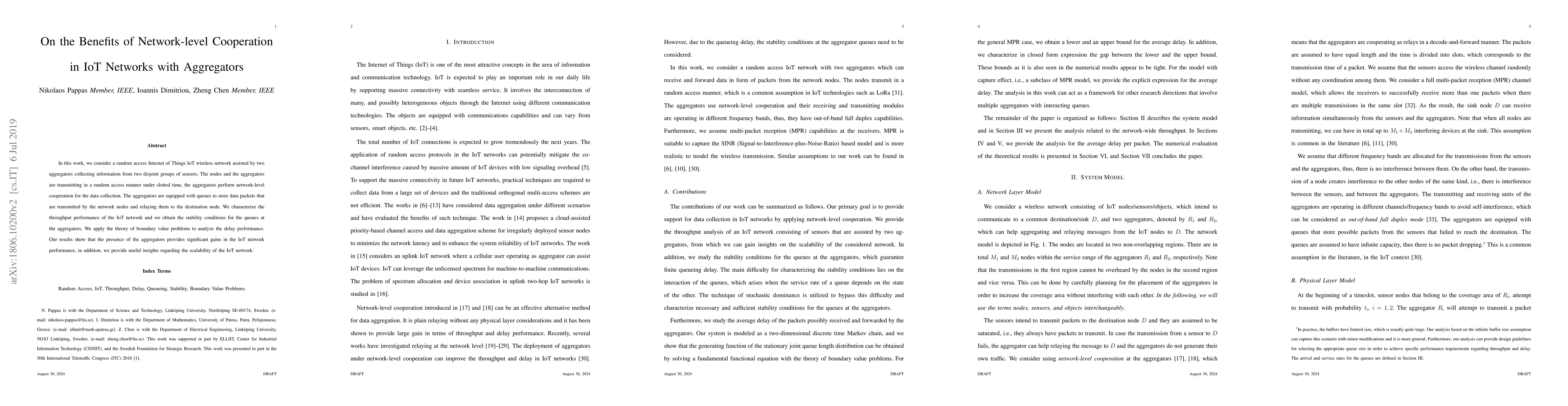 In this work, we consider a random access Internet of Things IoT wireless network assisted by two aggregators collecting information from two disjoint groups of sensors. The nodes and the aggregators are transmitting in a random access manner under slotted time, the aggregators perform network-level cooperation for the data collection. The aggregators are equipped with queues to store data packets that are transmitted by the network nodes and relaying them to the destination node. We characterize the throughput performance of the IoT network and we obtain the stability conditions for the queues at the aggregators. We apply the theory of boundary value problems to analyze the delay performance. Our results show that the presence of the aggregators provides significant gains in the IoT network performance, in addition, we provide useful insights regarding the scalability of the IoT network.