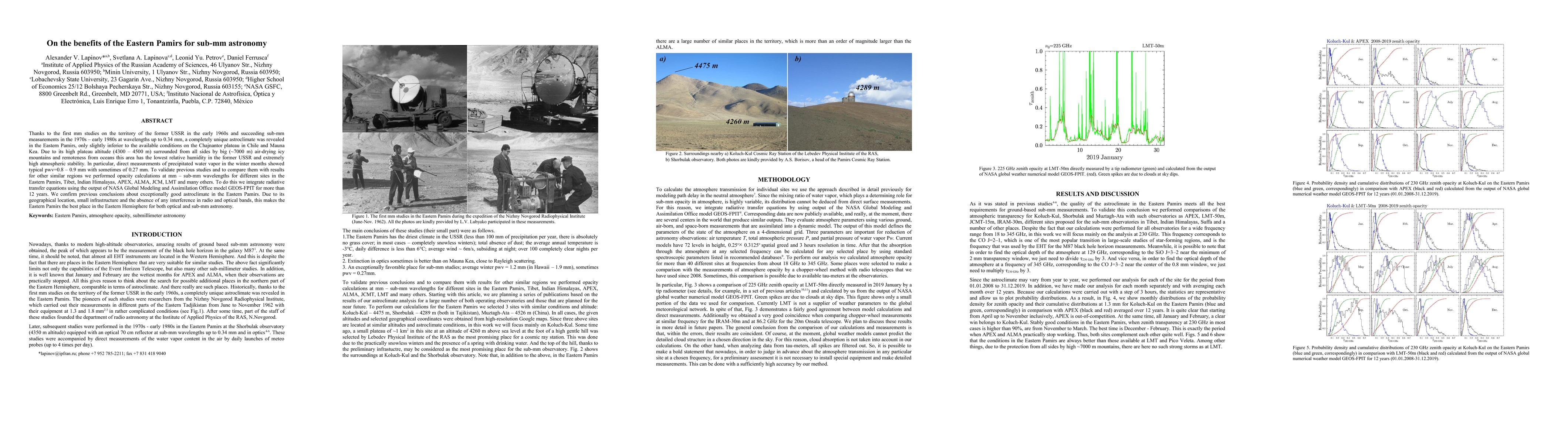 The Eastern Pamirs offer an exceptional astroclimate for sub-mm astronomy due to high altitude, low humidity, and atmospheric stability, making it a superior location in the Eastern Hemisphere for both optical and sub-mm astronomy.