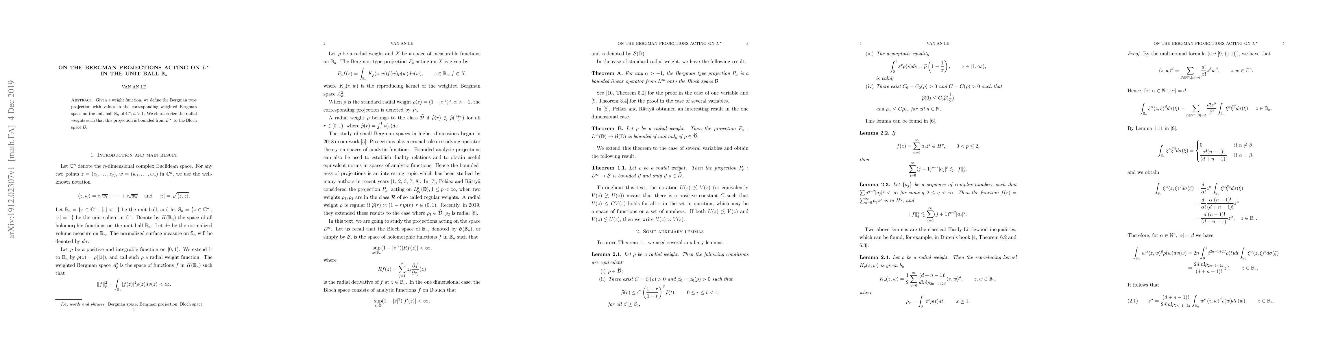 Summary: This paper defines Bergman type projections with weighted Bergman spaces on the unit ball in complex space and characterizes the radial weights ensuring these projections are bounded from $L^\infty$ to the Bloch space $\mathcal B$. The findings provide insight into the behavior of such projections under specific weight conditions.