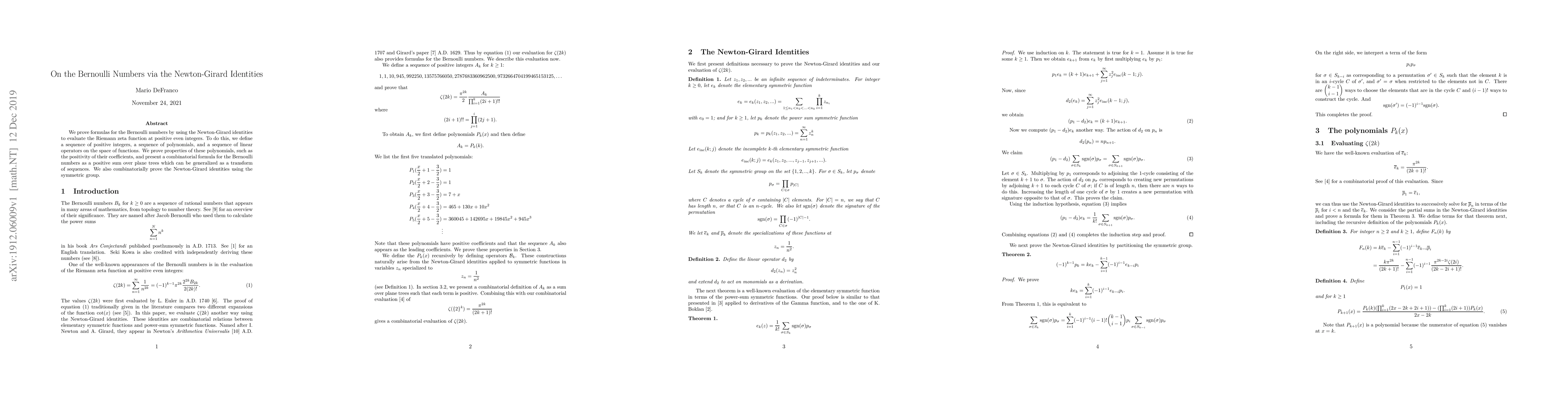 We prove formulas for the Bernoulli numbers by using the Newton-Girard identities to evaluate the Riemann zeta function at positive even integers. To do this, we define a sequence of positive integers, a sequence of polynomials, and a sequence of linear operators on the space of functions. We prove properties of these polynomials, such as the positivity of their coefficients, and present a combinatorial formula for the Bernoulli numbers as a positive sum over plane trees which can be generalized as a transform of sequences. We also combinatorially prove the Newton-Girard identities using the symmetric group.