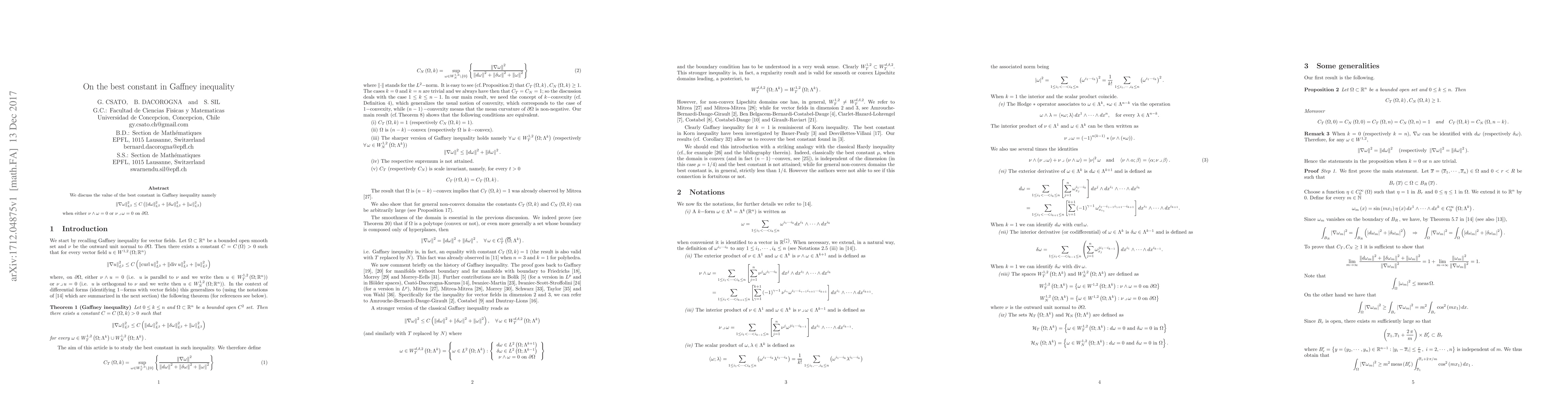 A research paper refines a mathematical inequality known as Gaffney's inequality, finding that the best constant in the inequality is related to the L2 norms of the gradient, divergence, and Laplacian of a function omega, with specific conditions on the boundary of a domain.