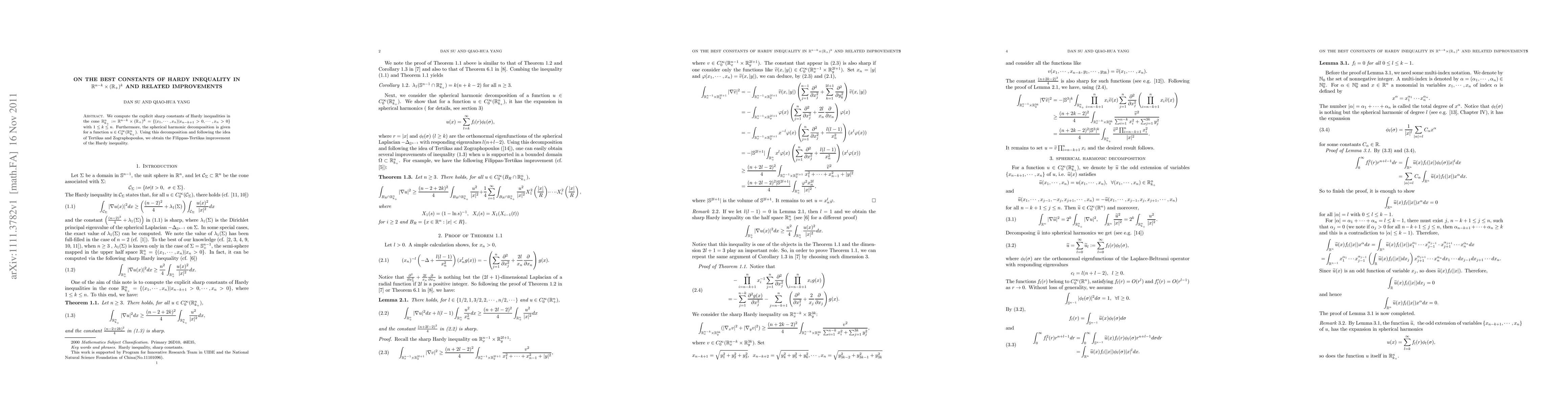 This paper determines the precise best constants for Hardy inequalities in the cone $\mathbb{R}_{k_+}^{n}$ and presents a spherical harmonic decomposition for smooth functions. It also introduces an improved version of the Hardy inequality following methods developed by Tertikas and Zographopoulos.