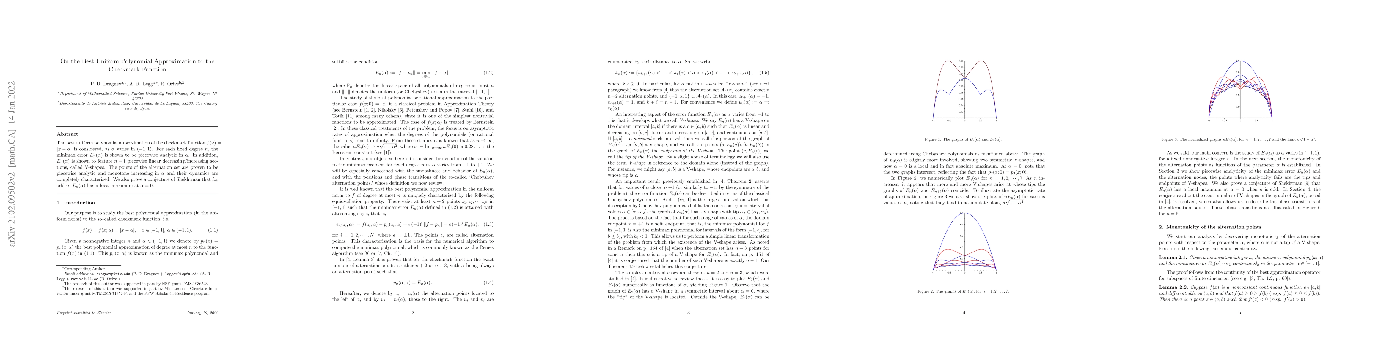 The best uniform polynomial approximation of the checkmark function $f(x)=|x-\alpha |$ is considered, as $\alpha$ varies in $(-1,1)$. For each fixed degree $n$, the minimax error $E_n (\alpha)$ is shown to be piecewise analytic in $\alpha$. In addition, $E_n(\alpha)$ is shown to feature $n-1$ piecewise linear decreasing/increasing sections, called V-shapes. The points of the alternation set are proven to be monotone increasing in $\alpha$ and their dynamics are completely characterized. We also prove a conjecture of Shekhtman that for odd $n$, $E_n(\alpha)$ has a local maximum at $\alpha=0$.