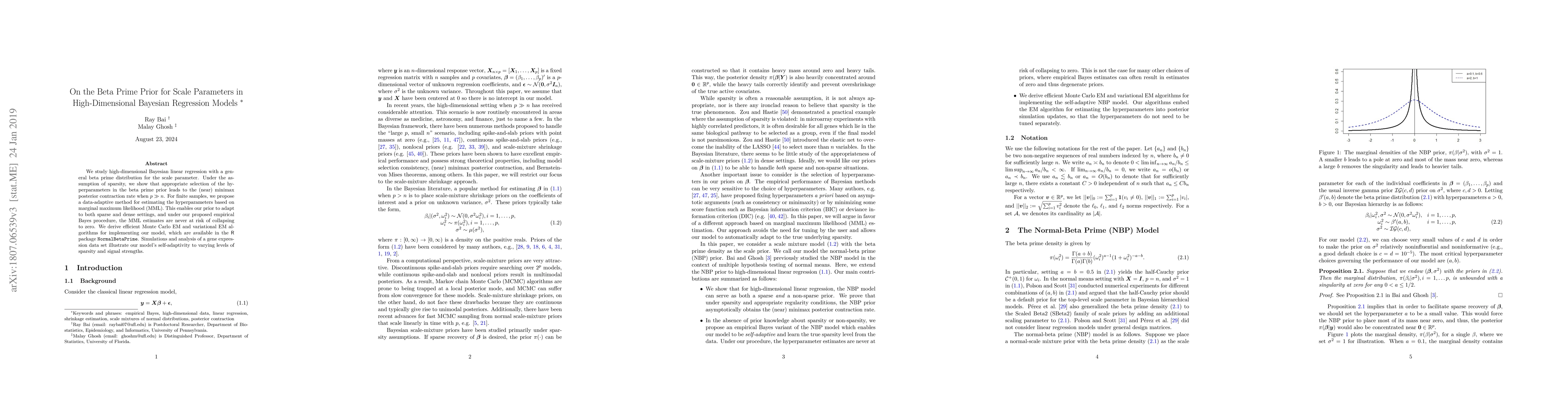 We study high-dimensional Bayesian linear regression with a general beta prime distribution for the scale parameter. Under the assumption of sparsity, we show that appropriate selection of the hyperparameters in the beta prime prior leads to the (near) minimax posterior contraction rate when $p \gg n$. For finite samples, we propose a data-adaptive method for estimating the hyperparameters based on marginal maximum likelihood (MML). This enables our prior to adapt to both sparse and dense settings, and under our proposed empirical Bayes procedure, the MML estimates are never at risk of collapsing to zero. We derive efficient Monte Carlo EM and variational EM algorithms for implementing our model, which are available in the R package NormalBetaPrime. Simulations and analysis of a gene expression data set illustrate our model's self-adaptivity to varying levels of sparsity and signal strengths.