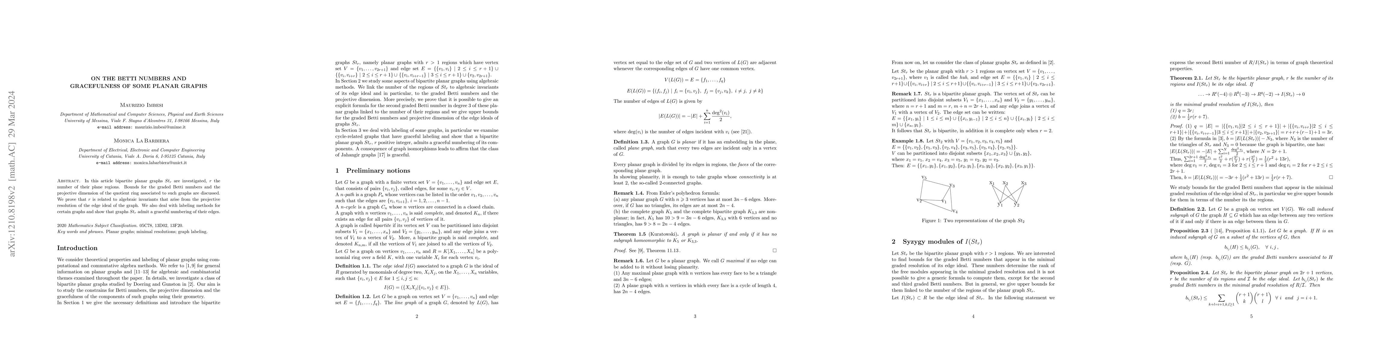 This paper investigates bipartite planar graphs St_r, examining bounds for their graded Betti numbers and projective dimension, proving connections between the number of plane regions and algebraic invariants derived from the graph's edge ideal. It also demonstrates that St_r graphs can be gracefully numbered.