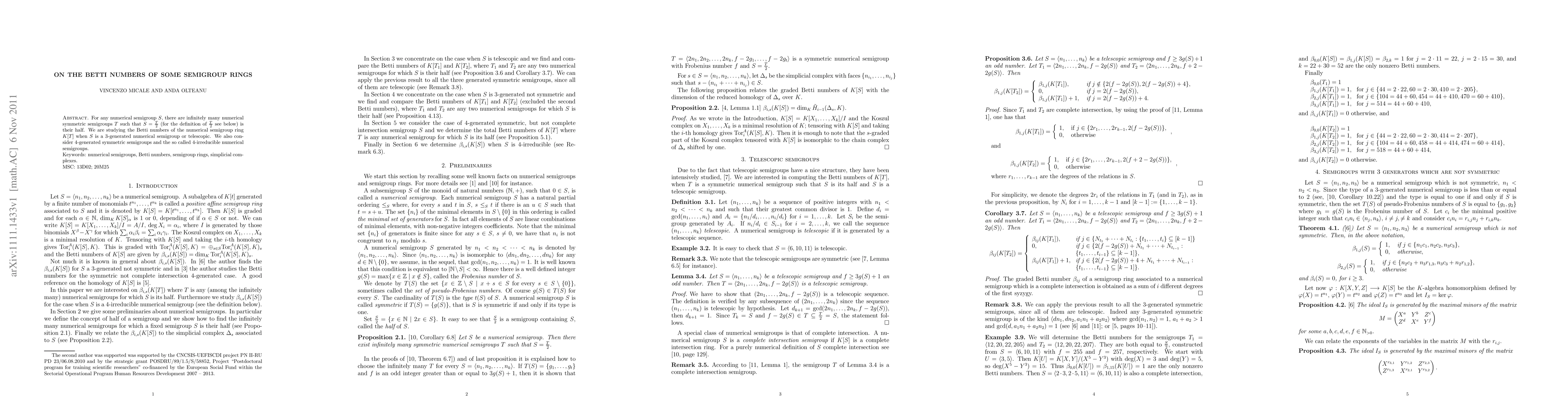 The paper examines the Betti numbers of semigroup rings for 3-generated and telescopic numerical semigroups, as well as 4-generated symmetric and 4-irreducible numerical semigroups. It explores the relationship between these semigroups and their corresponding half-semigroups.
