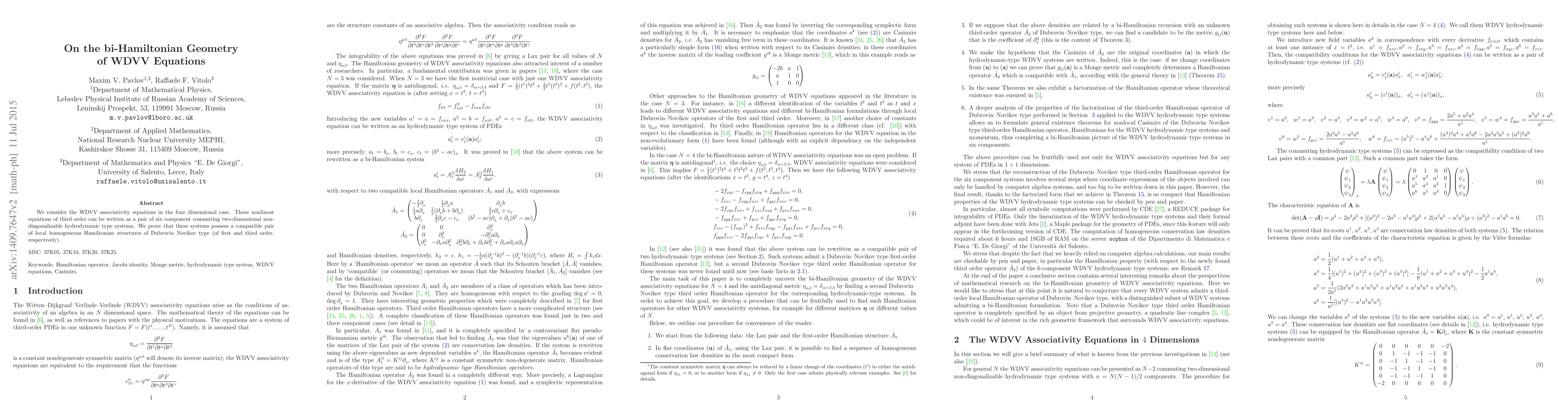 This paper investigates the WDVV associativity equations in four dimensions, showing they form a pair of commuting hydrodynamic systems. The authors prove the existence of a compatible pair of local Hamiltonian structures, highlighting their Dubrovin-Novikov nature.