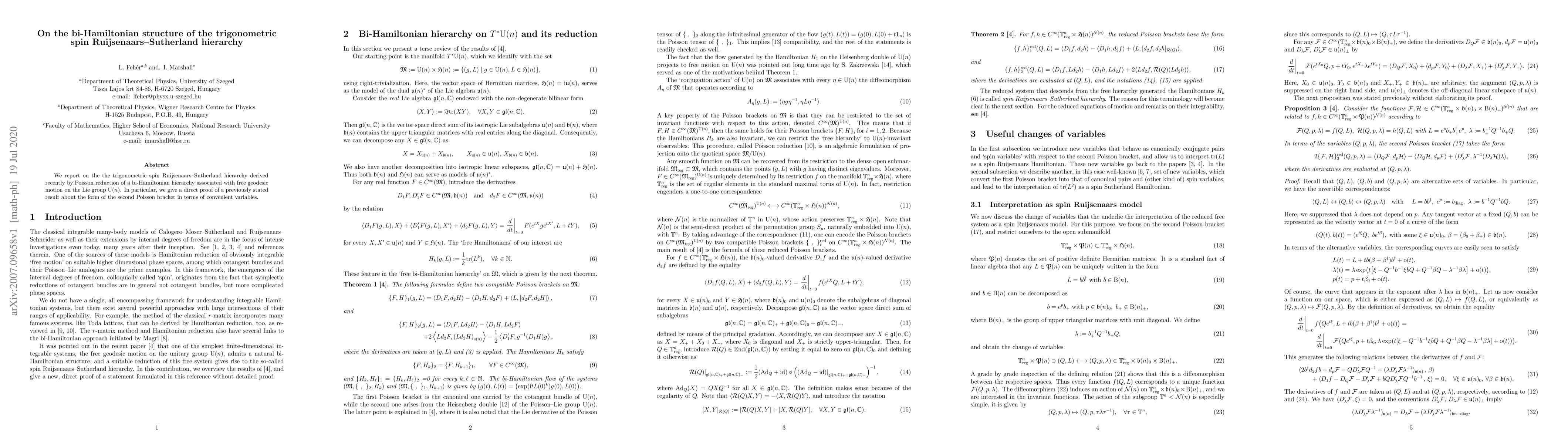 We report on the the trigonometric spin Ruijsenaars--Sutherland hierarchy derived recently by Poisson reduction of a bi-Hamiltonian hierarchy associated with free geodesic motion on the Lie group U(n). In particular, we give a direct proof of a previously stated result about the form of the second Poisson bracket in terms of convenient variables.