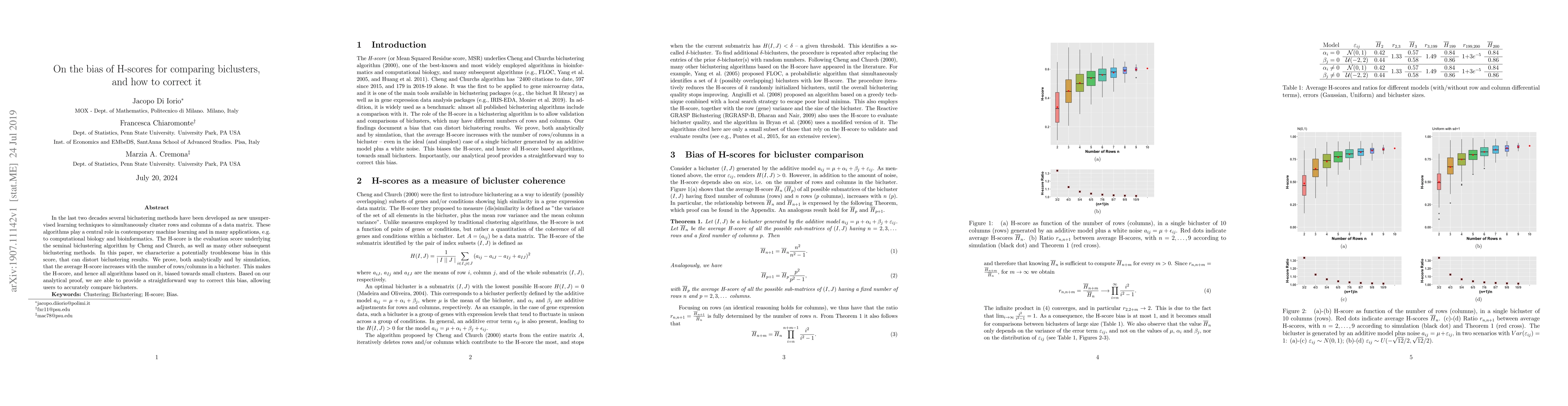 This paper identifies a bias in the H-score used for evaluating biclustering algorithms, showing that it tends to favor smaller clusters. The authors propose a correction method based on analytical proofs and simulations to enable accurate bicluster comparisons.