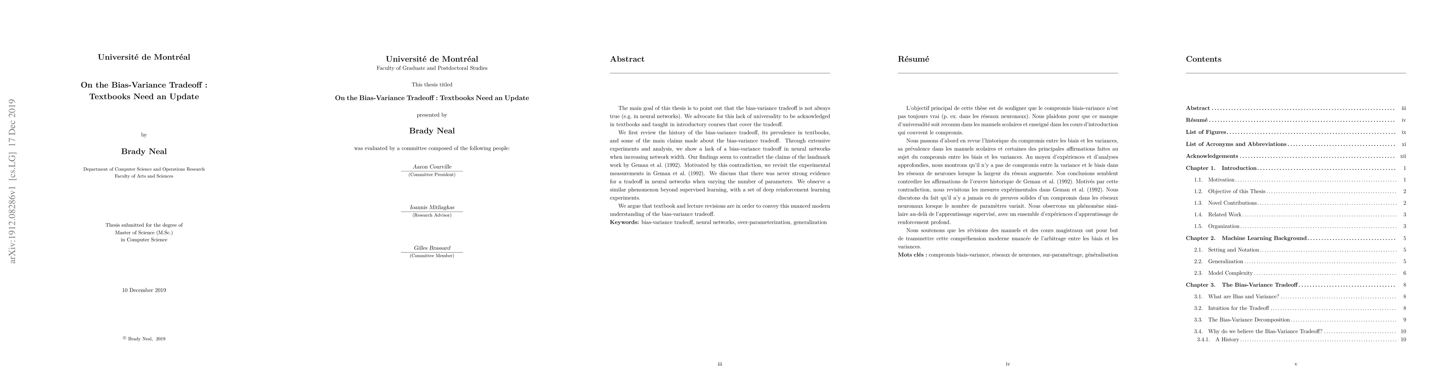 The main goal of this thesis is to point out that the bias-variance tradeoff is not always true (e.g. in neural networks). We advocate for this lack of universality to be acknowledged in textbooks and taught in introductory courses that cover the tradeoff. We first review the history of the bias-variance tradeoff, its prevalence in textbooks, and some of the main claims made about the bias-variance tradeoff. Through extensive experiments and analysis, we show a lack of a bias-variance tradeoff in neural networks when increasing network width. Our findings seem to contradict the claims of the landmark work by Geman et al. (1992). Motivated by this contradiction, we revisit the experimental measurements in Geman et al. (1992). We discuss that there was never strong evidence for a tradeoff in neural networks when varying the number of parameters. We observe a similar phenomenon beyond supervised learning, with a set of deep reinforcement learning experiments. We argue that textbook and lecture revisions are in order to convey this nuanced modern understanding of the bias-variance tradeoff.
