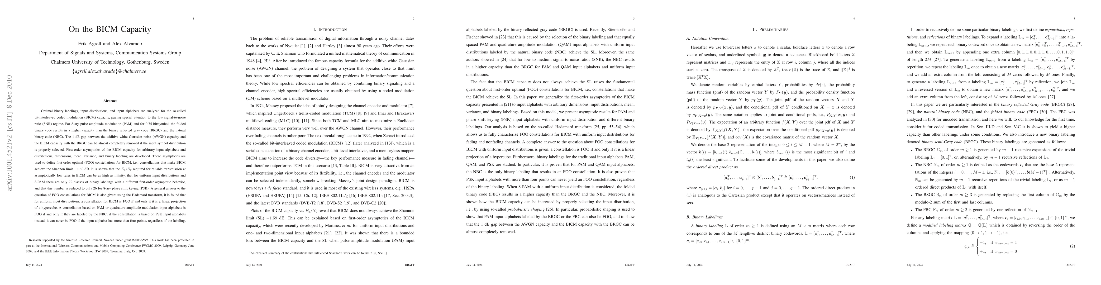 The paper analyzes optimal binary labelings, input distributions, and input alphabets for BICM capacity, focusing on the low SNR regime. It uses first-order asymptotics for arbitrary input alphabets, distributions, dimensions, mean, variance, and binary labeling.
