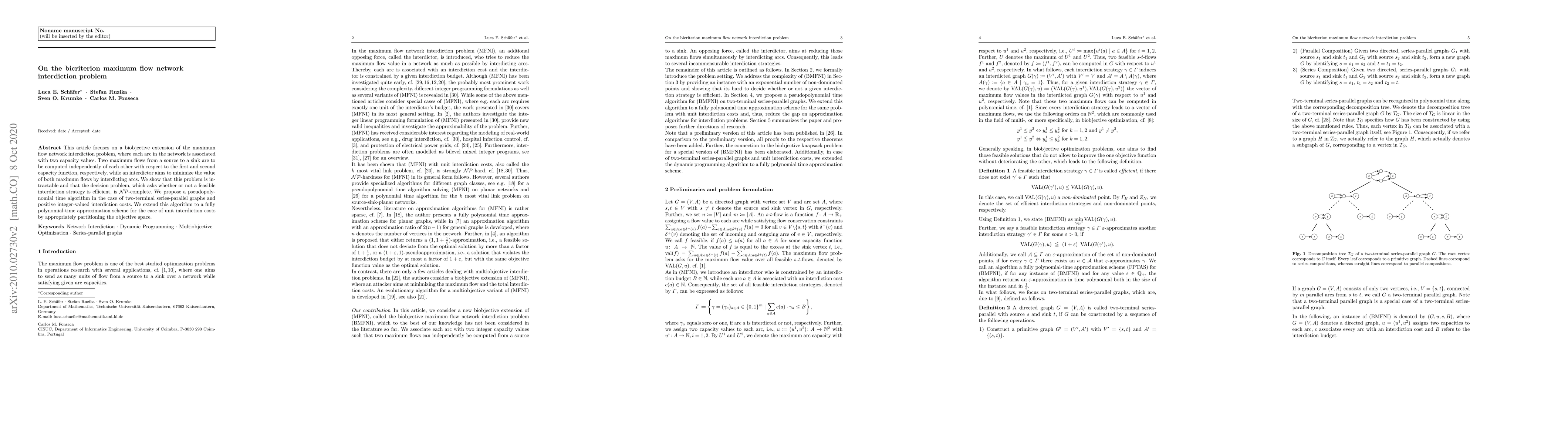 This paper studies a biobjective maximum flow network interdiction problem where two independent maximum flows are computed based on distinct capacity functions, while an interdictor aims to minimize both flows by removing arcs. The authors prove the problem's NP-completeness and propose a pseudopolynomial algorithm for series-parallel graphs with integer interdiction costs, extending it to a polynomial-time approximation scheme for unit costs.