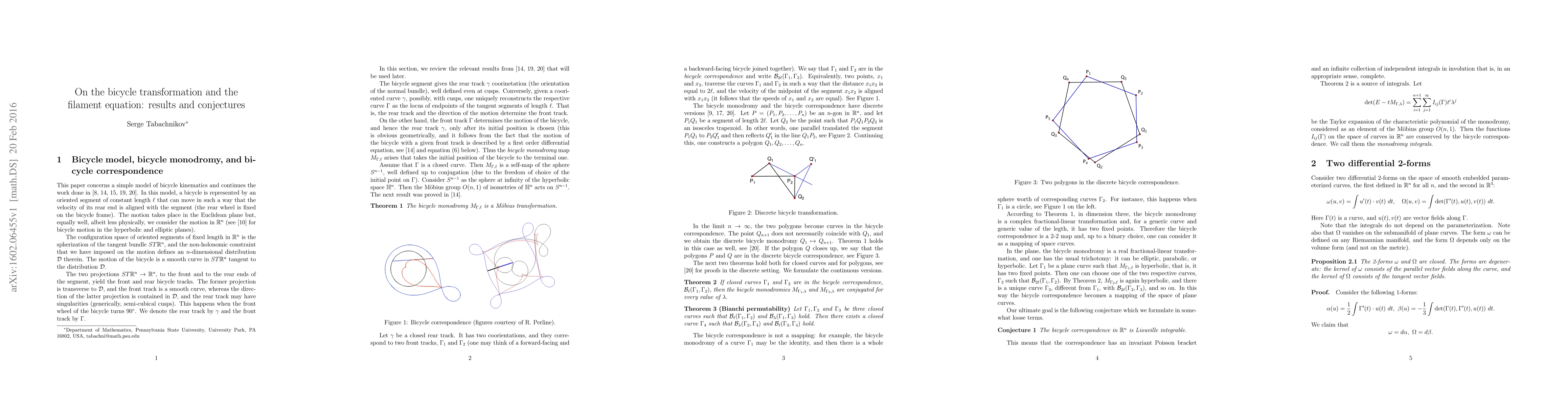 This paper explores a model of bicycle kinematics where a bicycle is represented as an oriented segment in n-dimensional space, focusing on the correspondence between the front and rear end trajectories. It presents results supporting the conjecture that this correspondence is completely integrable, and in three dimensions, it relates to the Backlund transformation for the filament equation, highlighting its bi-Hamiltonian features and integrals.