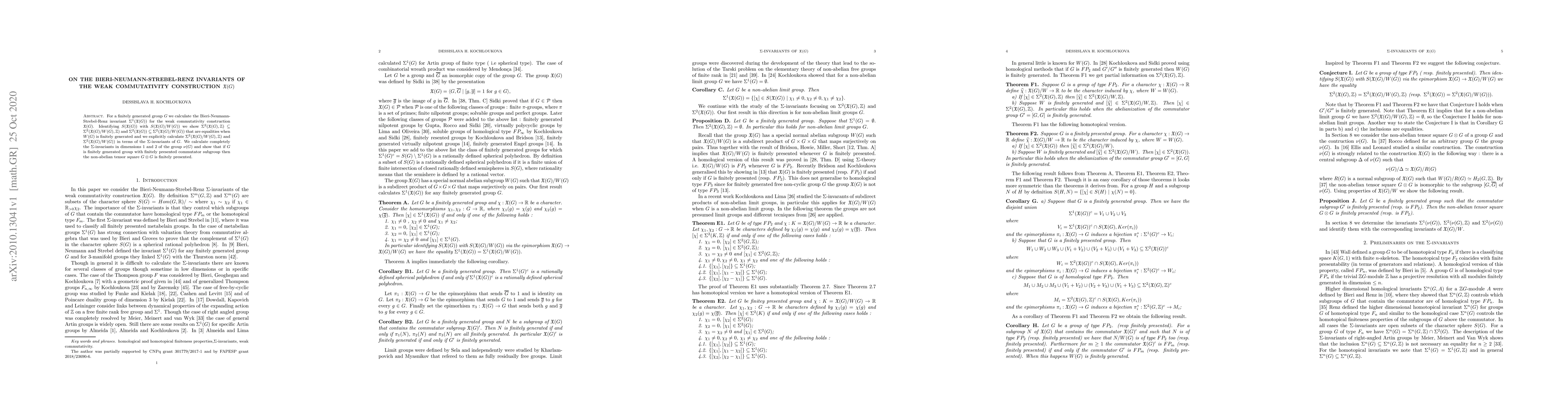 This paper calculates the Bieri-Neumann-Strebel-Renz invariants for the weak commutativity construction $\X(G)$ of a finitely generated group $G$, showing that $\Sigma^2(\X(G),\Z)$ and $\Sigma^2(\X(G)/ W(G))$ are equal when $W(G)$ is finitely generated, and completely determines the $\Sigma$-invariants in dimensions 1 and 2 for the group $\nu(G)$.