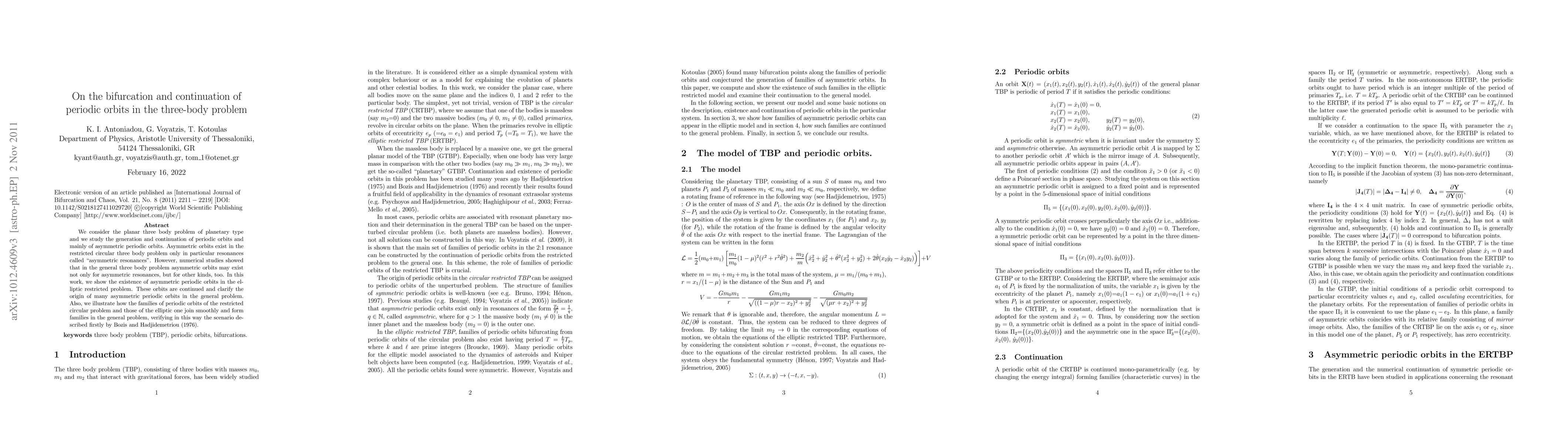 This paper investigates the generation and continuation of asymmetric periodic orbits in the three-body problem, demonstrating their existence in the elliptic restricted case and their smooth transition from the restricted circular problem, thus explaining the origin of asymmetric orbits in the general three-body scenario.
