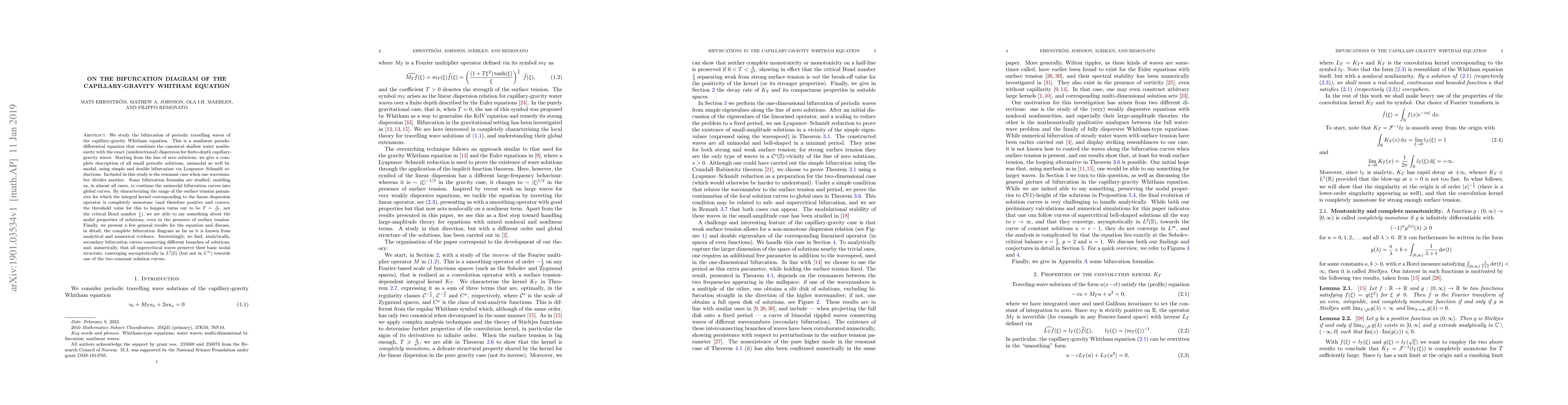 This paper investigates the bifurcation of periodic traveling waves in the capillary-gravity Whitham equation, detailing the emergence and properties of unimodal and bimodal solutions through simple and double bifurcations. It also explores the nodal properties and secondary bifurcation curves, revealing the asymptotic convergence of supercritical waves in \(L^2\) norm.