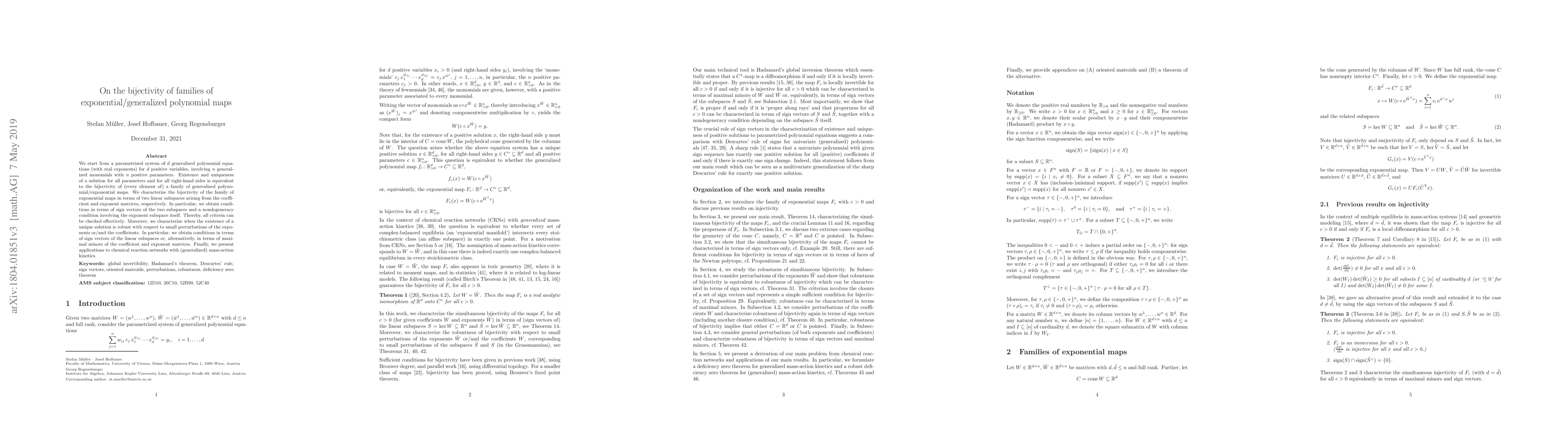 A research paper investigates the bijectivity of families of exponential and generalized polynomial maps, providing conditions for their existence and uniqueness in terms of linear subspaces and sign vectors, with applications to chemical reaction networks.