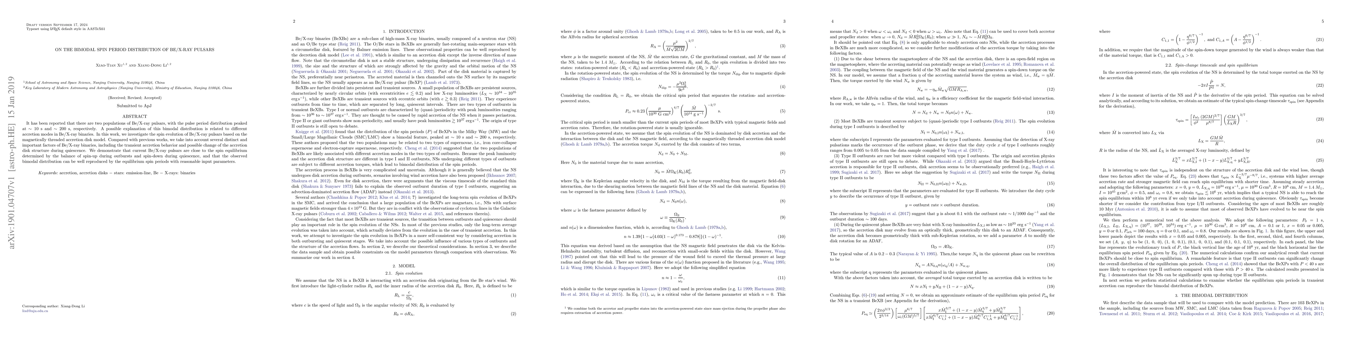 This paper investigates the bimodal spin period distribution of Be/X-ray pulsars, explaining it through different accretion modes and transient behaviors. It shows that the observed periods can be reproduced by considering spin equilibrium between spin-up and spin-down phases.