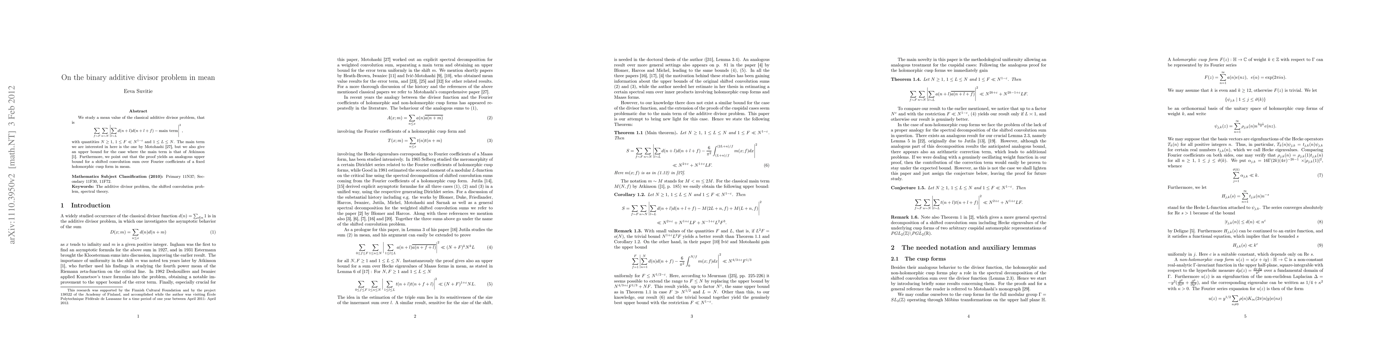 The paper investigates the mean value of the classical additive divisor problem, focusing on Motohashi's main term, while also providing an upper bound for Atkinson's case and revealing an analogous result for a shifted convolution sum of Fourier coefficients of a holomorphic cusp form.