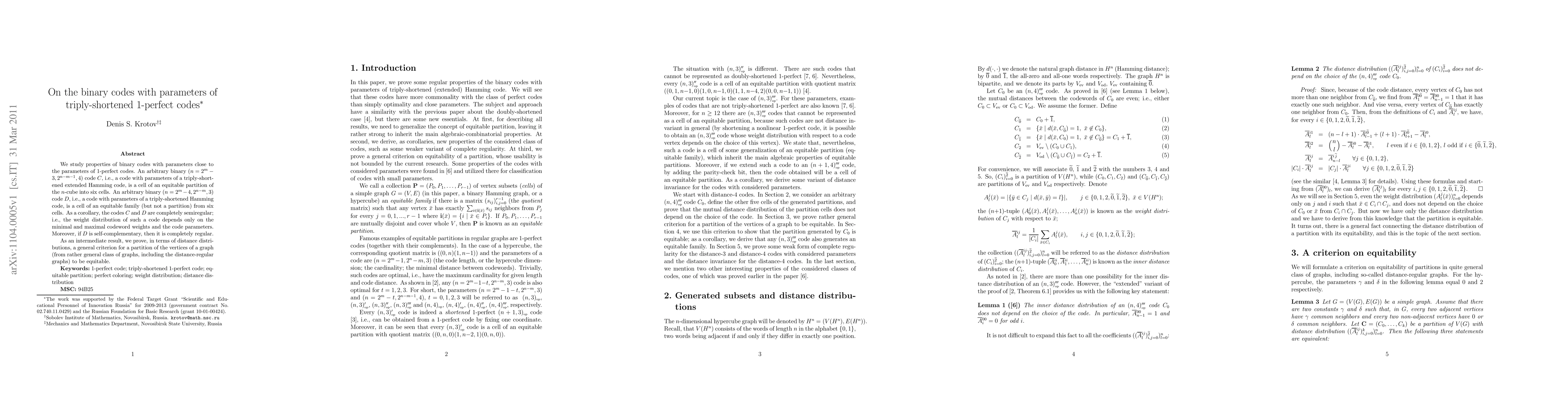 We study properties of binary codes with parameters close to the parameters of 1-perfect codes. An arbitrary binary $(n=2^m-3, 2^{n-m-1}, 4)$ code $C$, i.e., a code with parameters of a triply-shortened extended Hamming code, is a cell of an equitable partition of the $n$-cube into six cells. An arbitrary binary $(n=2^m-4, 2^{n-m}, 3)$ code $D$, i.e., a code with parameters of a triply-shortened Hamming code, is a cell of an equitable family (but not a partition) from six cells. As a corollary, the codes $C$ and $D$ are completely semiregular; i.e., the weight distribution of such a code depends only on the minimal and maximal codeword weights and the code parameters. Moreover, if $D$ is self-complementary, then it is completely regular. As an intermediate result, we prove, in terms of distance distributions, a general criterion for a partition of the vertices of a graph (from rather general class of graphs, including the distance-regular graphs) to be equitable. Keywords: 1-perfect code; triply-shortened 1-perfect code; equitable partition; perfect coloring; weight distribution; distance distribution