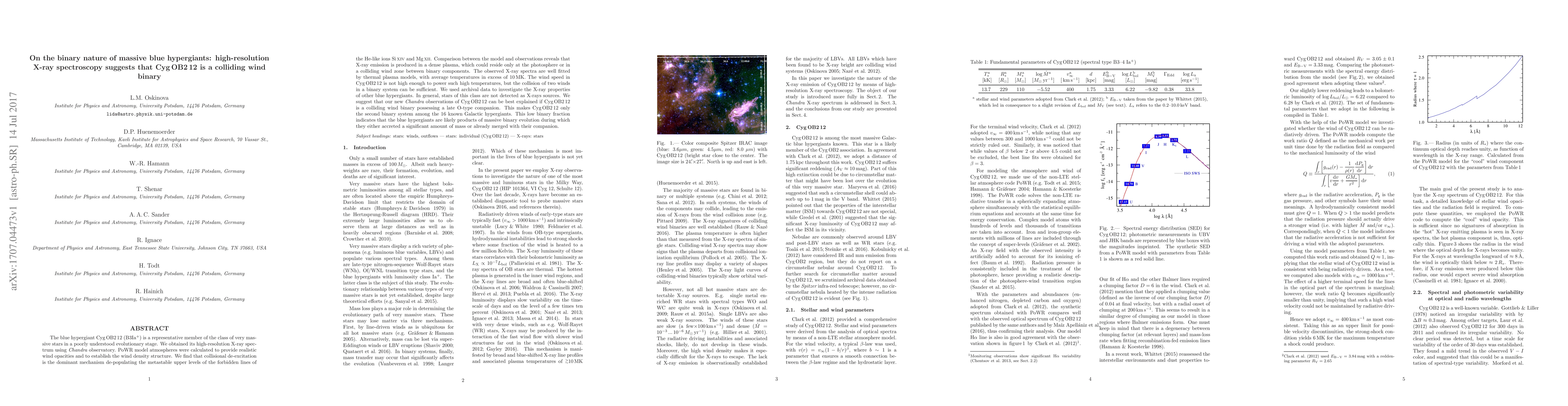 This study reveals that Cyg OB2-12, a massive blue hypergiant, is likely a colliding wind binary based on high-resolution X-ray spectroscopy from Chandra. The X-ray emission suggests the presence of a late O-type companion, indicating a low binary fraction among blue hypergiants.