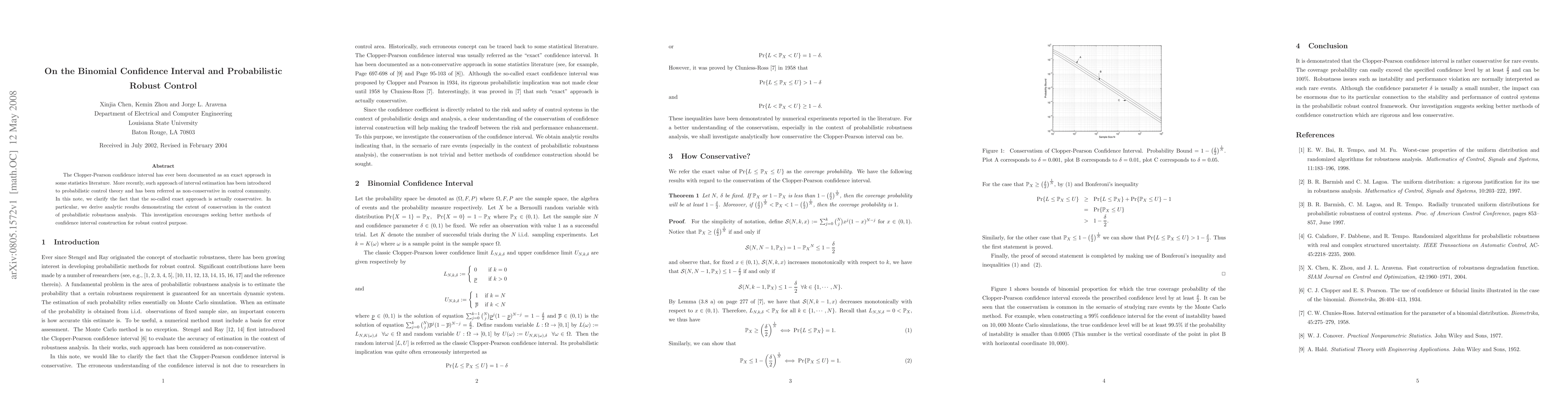 A new study clarifies that the Clopper-Pearson confidence interval is actually conservative in probabilistic robust control theory, encouraging the search for better methods of confidence interval construction.