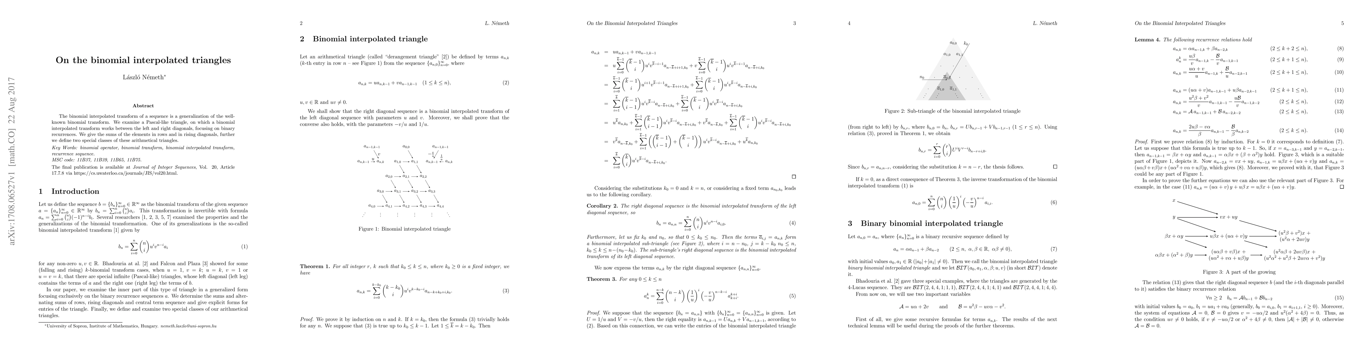 This paper explores the binomial interpolated transform applied to a Pascal-like triangle, focusing on binary recurrences and deriving sums for rows and rising diagonals. It also introduces two special classes of these arithmetical triangles.