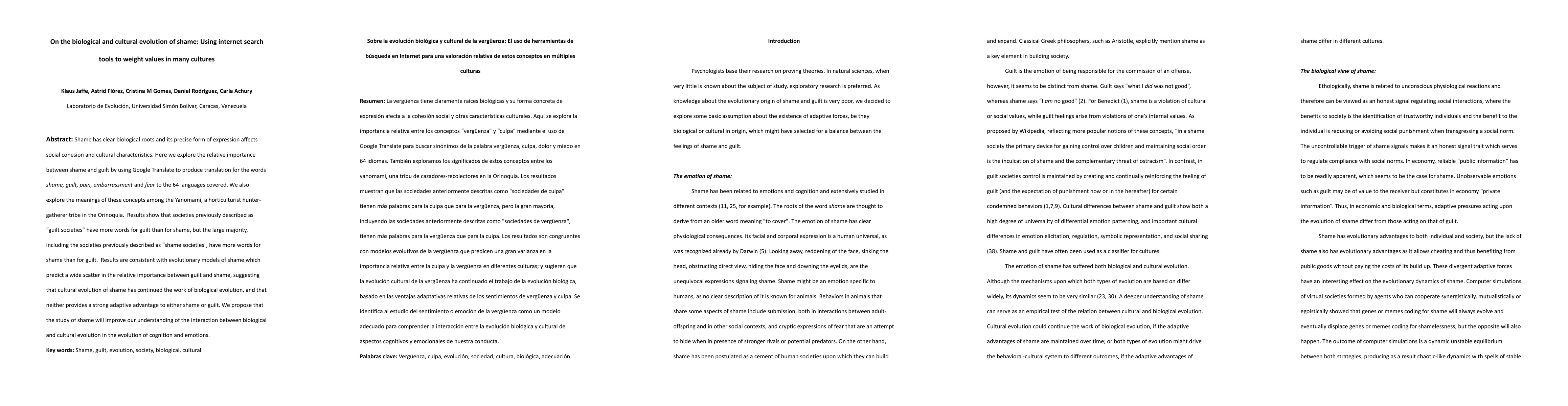 Shame has clear biological roots and its precise form of expression affects social cohesion and cultural characteristics. Here we explore the relative importance between shame and guilt by using Google Translate to produce translation for the words shame, guilt, pain, embarrassment and fear to the 64 languages covered. We also explore the meanings of these concepts among the Yanomami, a horticulturist hunter-gatherer tribe in the Orinoquia. Results show that societies previously described as 'guilt societies' have more words for guilt than for shame, but the large majority, including the societies previously described as 'shame societies', have more words for shame than for guilt. Results are consistent with evolutionary models of shame which predict a wide scatter in the relative importance between guilt and shame, suggesting that cultural evolution of shame has continued the work of biological evolution, and that neither provides a strong adaptive advantage to either shame or guilt. We propose that the study of shame will improve our understanding of the interaction between biological and cultural evolution in the evolution of cognition and emotions.