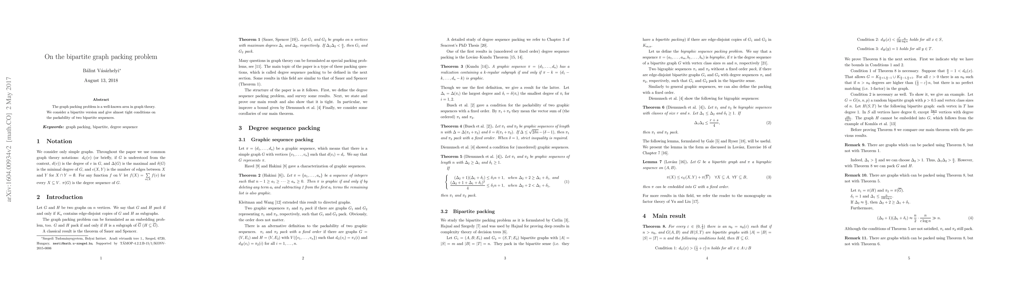 Researchers explore a bipartite graph packing problem, finding almost tight conditions for packability of two bipartite sequences, with implications for graph theory and potential applications in computer science and data analysis.