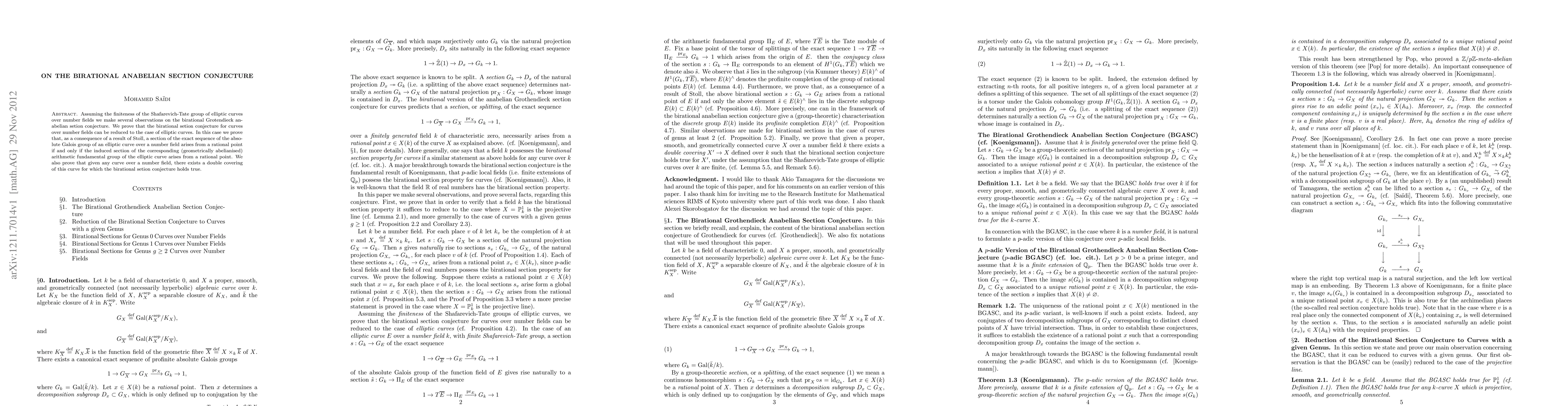 Assuming the finiteness of the Shafarevich-Tate group of elliptic curves over number fields we make several observations on the birational Grotendieck anabelian setion conjecture. We prove that the birational setion conjecture for curves over number fields can be reduced to the case of elliptic curves. In this case we prove that, as a consequence of a result of Stoll, a section of the exact sequence of the absolute Galois group of an elliptic curve over a number field arises from a rational point if and only if the induced section of the corresponding (geometrically abelianised) arithmetic fundamental group of the elliptic curve arises from a rational point. We also prove that given any curve over a number field, there exists a double covering of this curve for which the birational setion conjecture holds true.