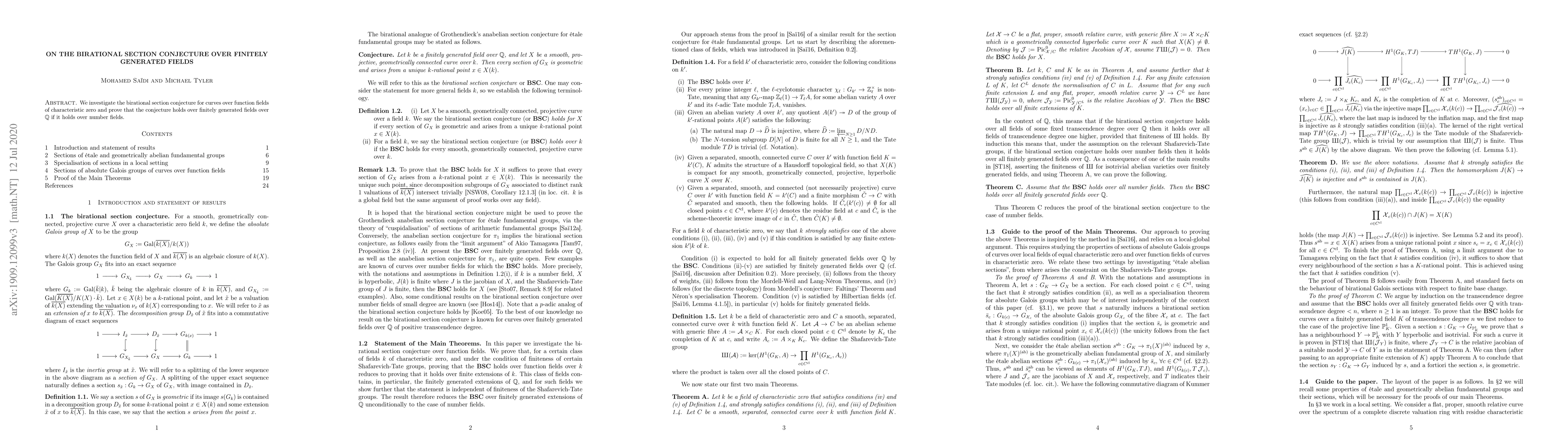 Summary: This paper investigates the birational section conjecture for curves over function fields of characteristic zero and proves that if the conjecture holds for number fields, it also holds for finitely generated fields over Q.