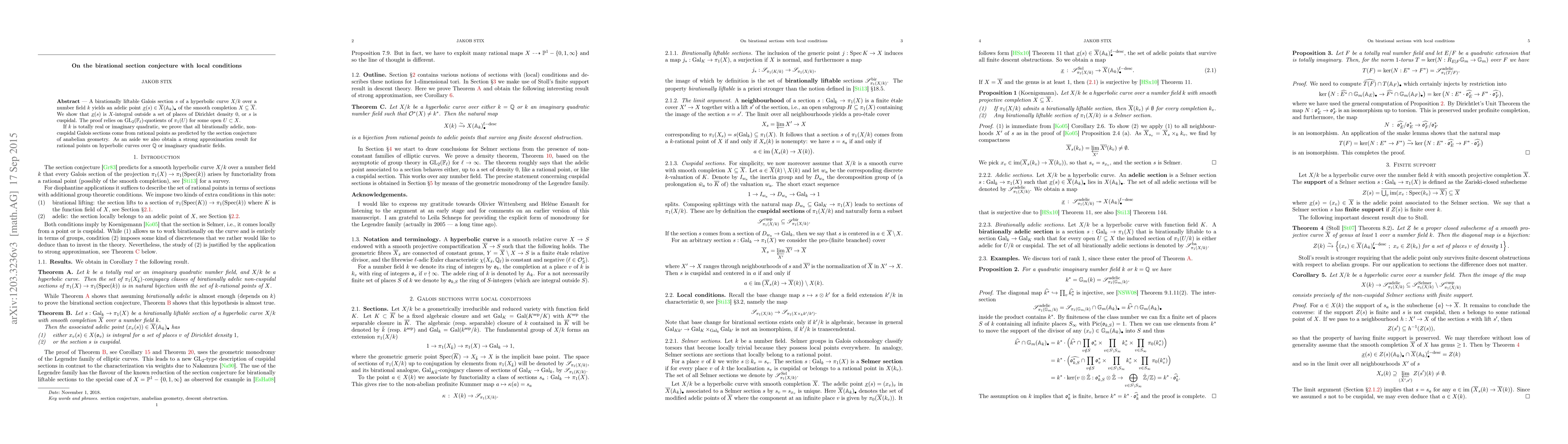 A birationally liftable Galois section s of a hyperbolic curve X/k over a number field k yields an adelic point x(s) in the smooth completion of X. We show that x(s) is X-integral outside a set of places of Dirichlet density 0, or s is cuspidal. The proof relies on $GL_2(F_\ell)$-quotients of $\pi_1(U)$ for some open U of X. If k is totally real or imaginary quadratic, we prove that all birationally adelic, non-cuspidal Galois sections come from rational points as predicted by the section conjecture of anabelian geometry. As an aside we also obtain a strong approximation result for rational points on hyperbolic curves over Q or imaginary quadratic fields.