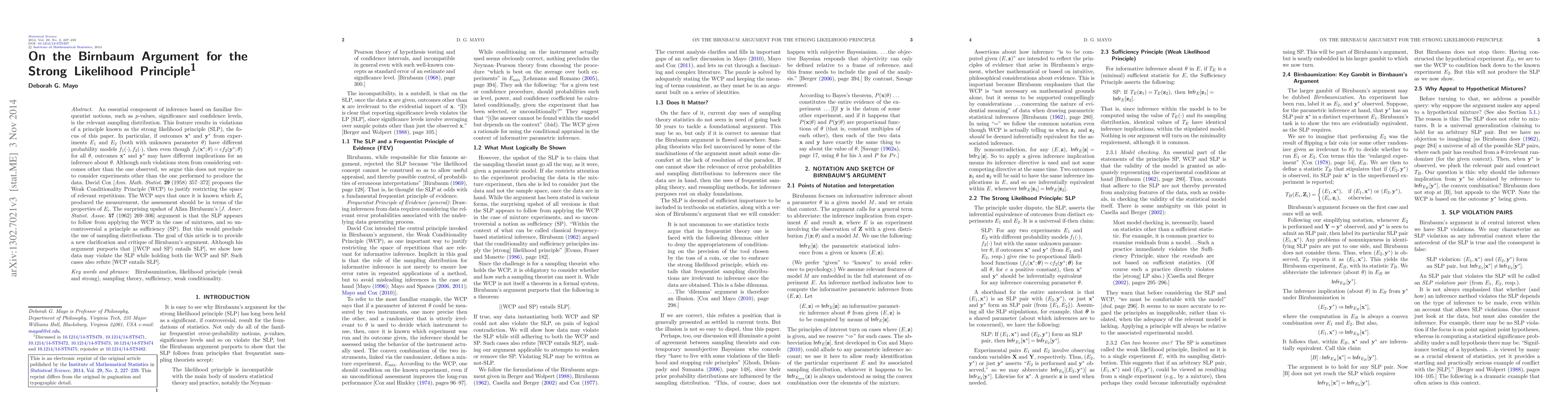 An essential component of inference based on familiar frequentist notions, such as $p$-values, significance and confidence levels, is the relevant sampling distribution. This feature results in violations of a principle known as the strong likelihood principle (SLP), the focus of this paper. In particular, if outcomes $\mathbf{x}^*$ and $\mathbf{y}^*$ from experiments $E_1$ and $E_2$ (both with unknown parameter $\theta$) have different probability models $f_1(\cdot),f_2(\cdot)$, then even though $f_1(\mathbf{x}^*;\theta)=cf_2(\mathbf{y}^*;\theta)$ for all $\theta$, outcomes $\mathbf{x}^*$ and $\mathbf{y}^*$ may have different implications for an inference about $\theta$. Although such violations stem from considering outcomes other than the one observed, we argue this does not require us to consider experiments other than the one performed to produce the data. David Cox [Ann. Math. Statist. 29 (1958) 357-372] proposes the Weak Conditionality Principle (WCP) to justify restricting the space of relevant repetitions. The WCP says that once it is known which $E_i$ produced the measurement, the assessment should be in terms of the properties of $E_i$. The surprising upshot of Allan Birnbaum's [J. Amer. Statist. Assoc. 57 (1962) 269-306] argument is that the SLP appears to follow from applying the WCP in the case of mixtures, and so uncontroversial a principle as sufficiency (SP). But this would preclude the use of sampling distributions. The goal of this article is to provide a new clarification and critique of Birnbaum's argument. Although his argument purports that [(WCP and SP) entails SLP], we show how data may violate the SLP while holding both the WCP and SP. Such cases also refute [WCP entails SLP].